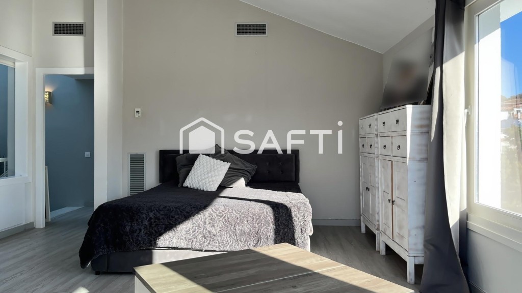 La planta superior dispone de dos dormitorios: uno de ellos es tipo suite con su propio baño integrado y el otro amplio y espacioso dormitorio cuenta con chimenea, grandes ventanales y acceso directo a la terraza privada con vistas panorámicas. Se entrega totalmente amueblada y equipada. Incluye garaje, lavadero/trastero.