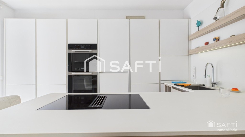 Cocina reformada y moderna, conectada estratégicamente al comedor y al exterior.