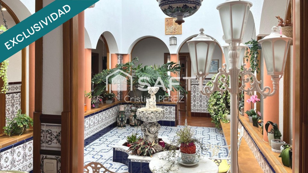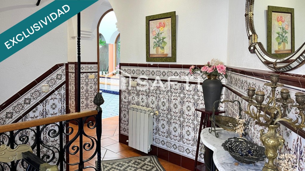 El acceso exterior nos encontramos con la zona ajardinada, desde donde se puede pasar a la piscina. Desde este punto, entramos al interior de la vivienda, donde nos da la bienvenida un bonito Patio Andaluz cubierto por una gran claraboya que inunda de luz natural toda la planta.