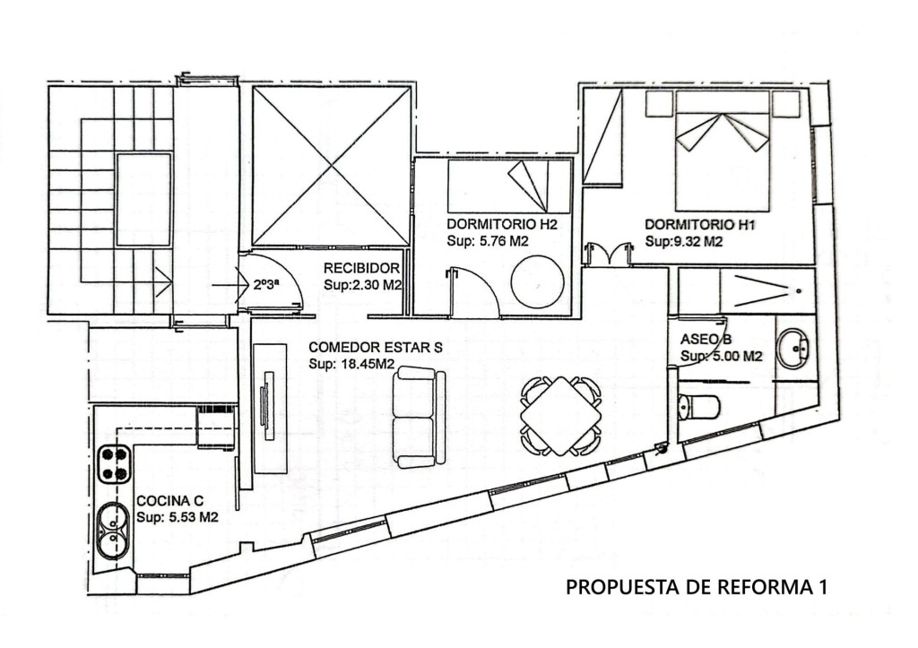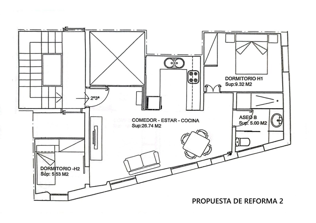 La vivienda se puede redistribuir muy fácilmente dejando una cocina abierta a un salón/comedor y dos dormitorios. Adjuntamos 2 propuestas de reforma.