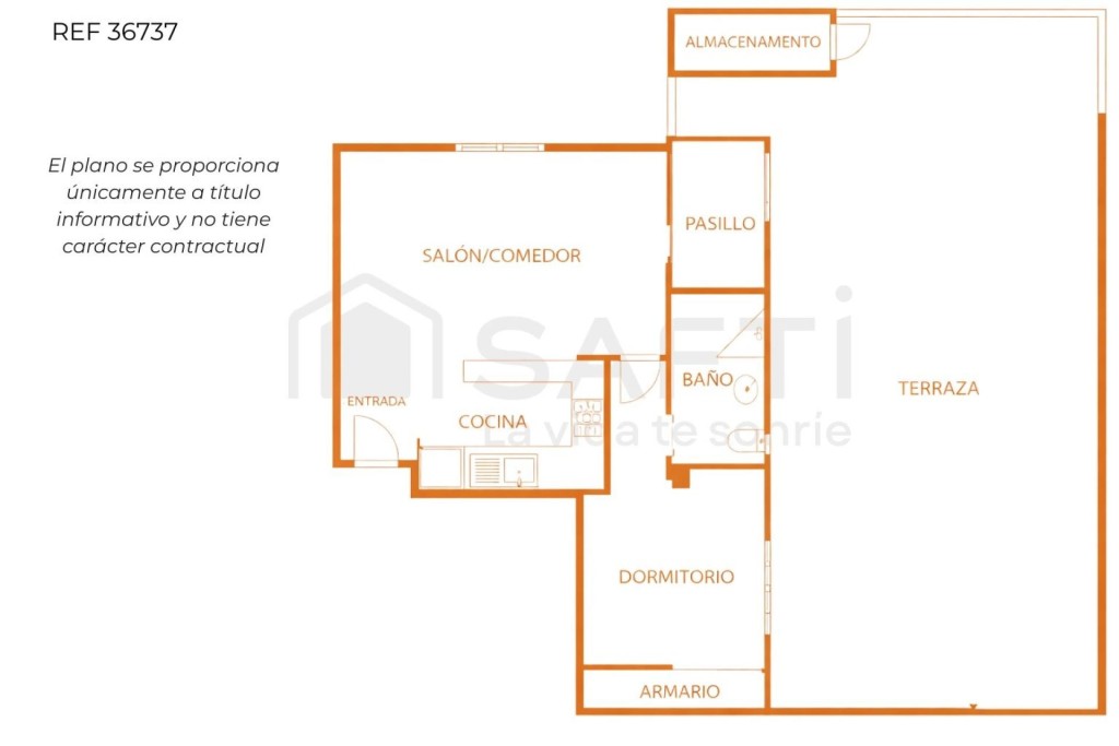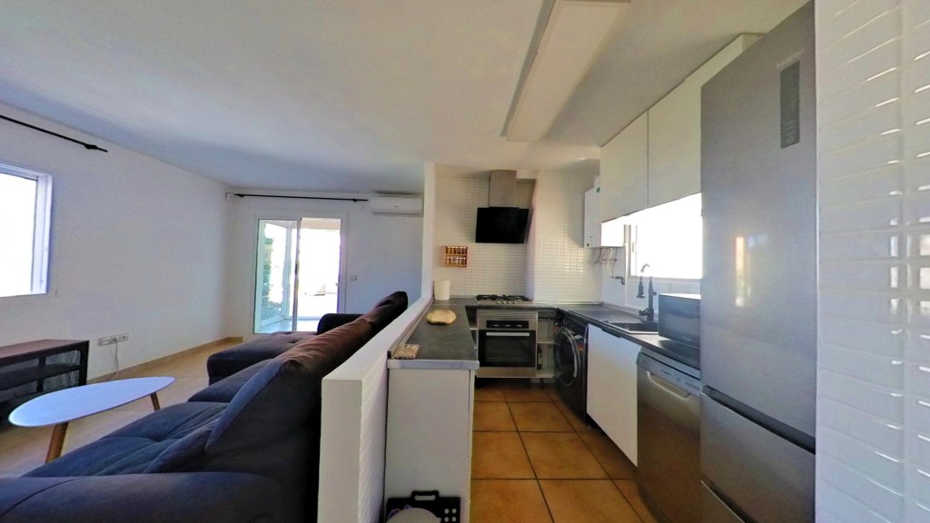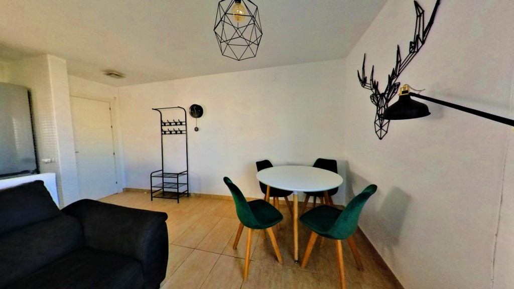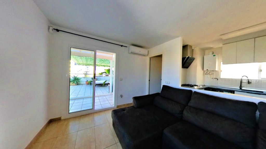 El interior es acogedor y funcional. El salón, muy luminoso, se abre directamente a la terraza, creando una sensación de continuidad entre ambos espacios. La cocina americana está equipada y aprovecha al máximo la distribución. El dormitorio cuenta con armario empotrado y el baño es completo. La vivienda ha sido reformada y dispone de ventanas climalit y aire acondicionado por split.