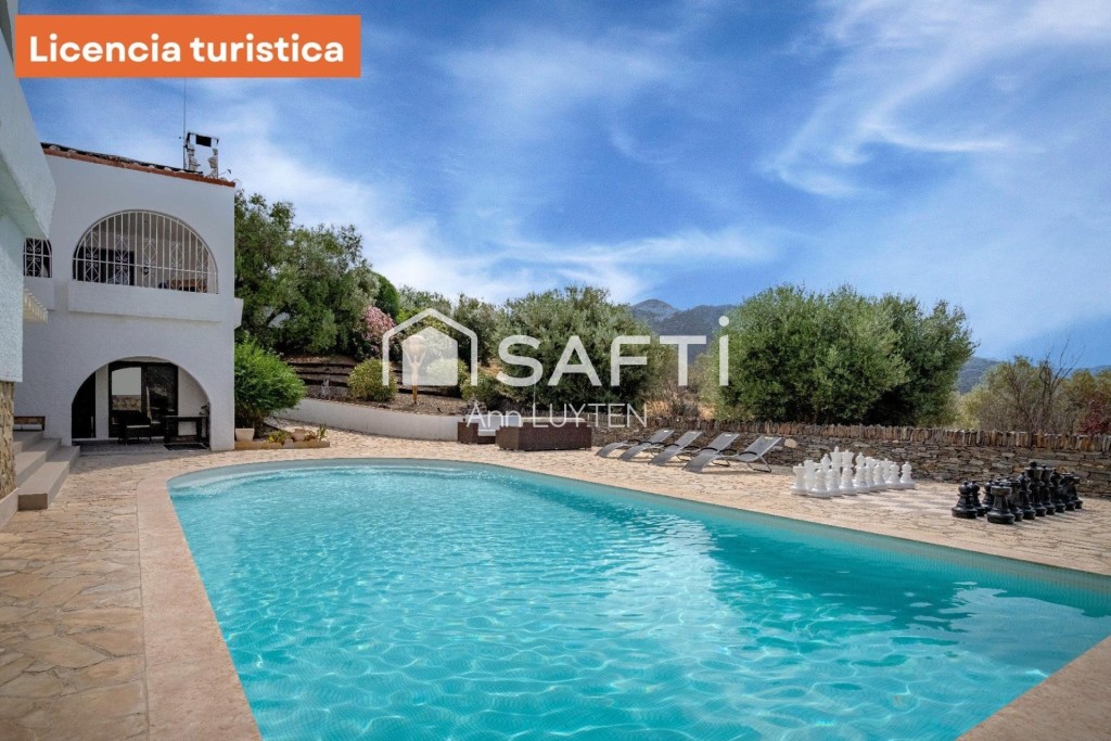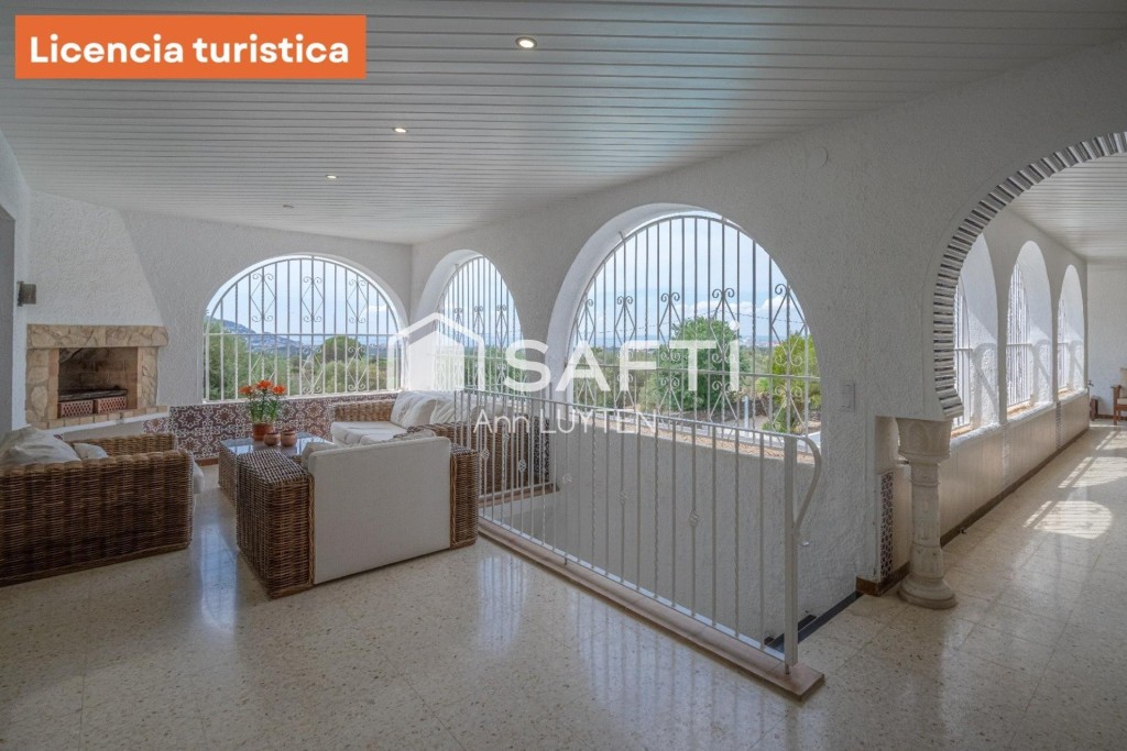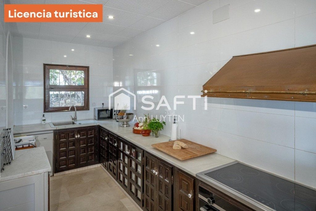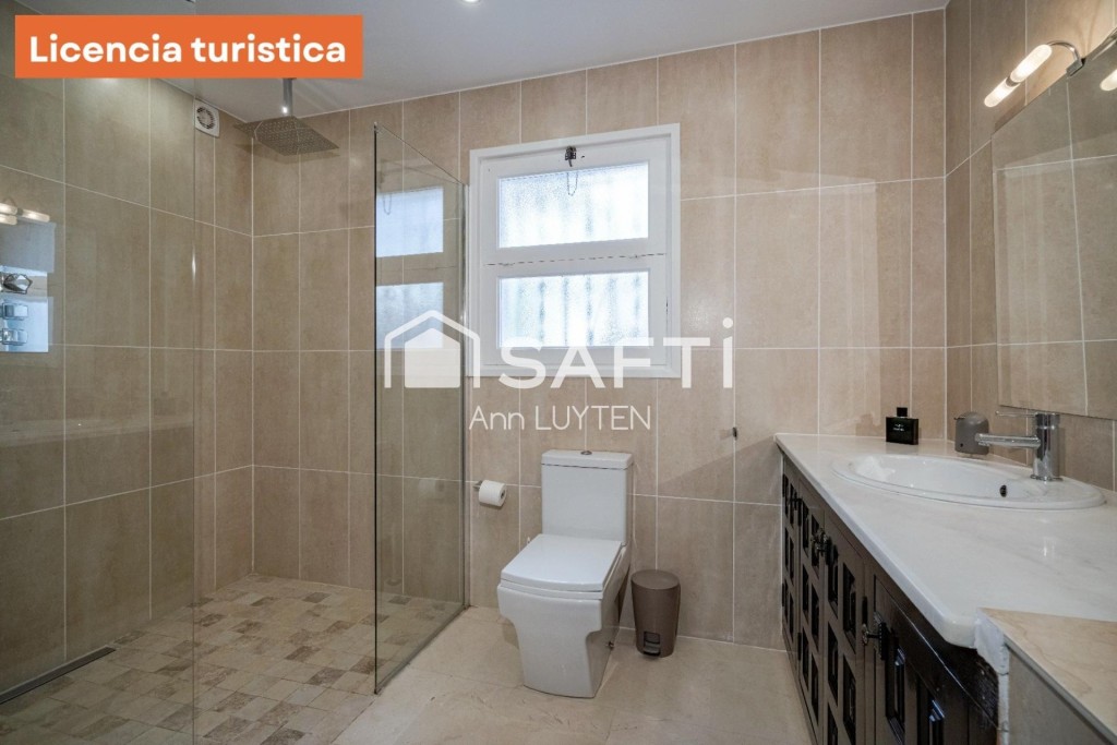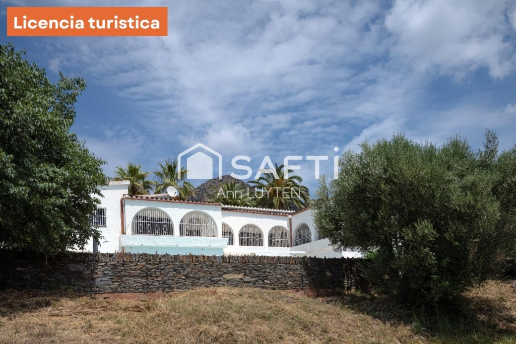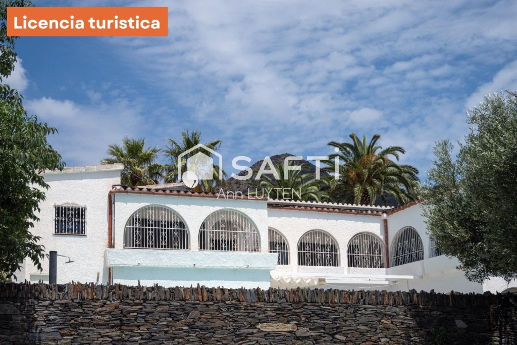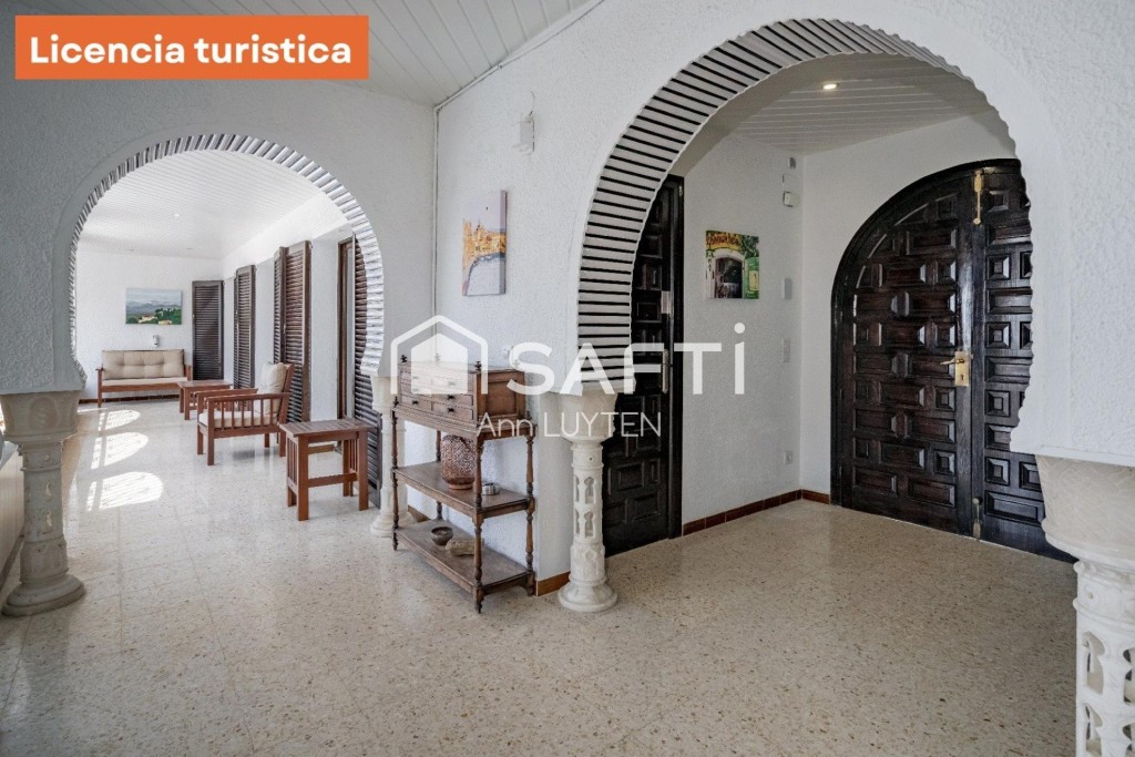 Una escalera exterior conduce a la planta baja, que cuenta con dos zonas de estar independientes, una suite adicional, dos dormitorios, un baño y lavadero. La propiedad está rodeada por un elegante muro de piedra natural y destaca por sus detalles arquitectónicos como columnas árabes y arcos de medio punto.