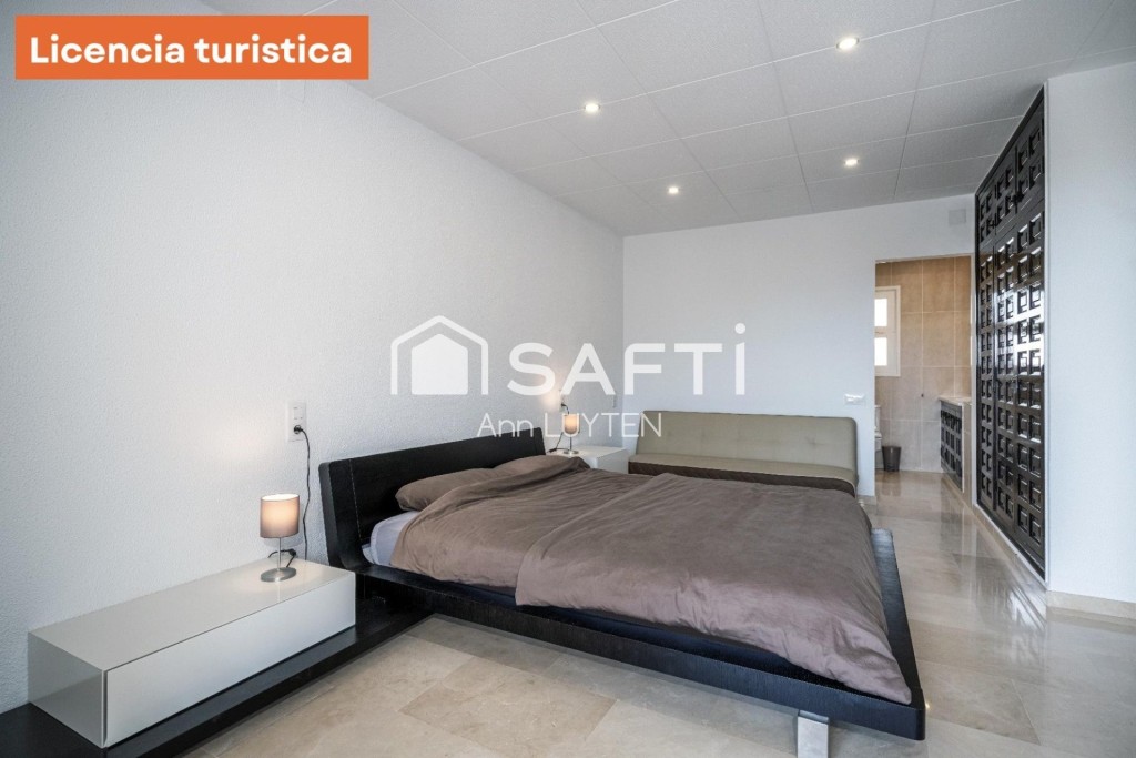 La planta superior dispone de salón-comedor con cocina abierta, una suite, dos dormitorios, un baño, un aseo y garaje. Todas las estancias tienen acceso a una amplia terraza cubierta con impresionantes vistas panorámicas al mar, las montañas y los olivares.