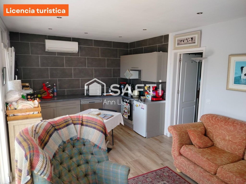 Mediante escalera interior y exterior se accede a la planta superior, compuesta por un luminoso salón con cocina americana totalmente equipada y un dormitorio con baño en suite. Desde el salón se accede a una terraza con vistas al mar. En la parte trasera de la vivienda hay un jardín muy privado con agradable zona de estar y un trastero. La casa se encuentra en muy buen estado, ya que fue completamente renovada hace unos años.