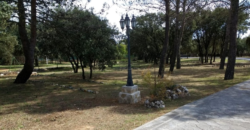 Cenador de 170 m², con suelo de hormigón impreso, mesa y bancos de piedra, rodeado de árboles
