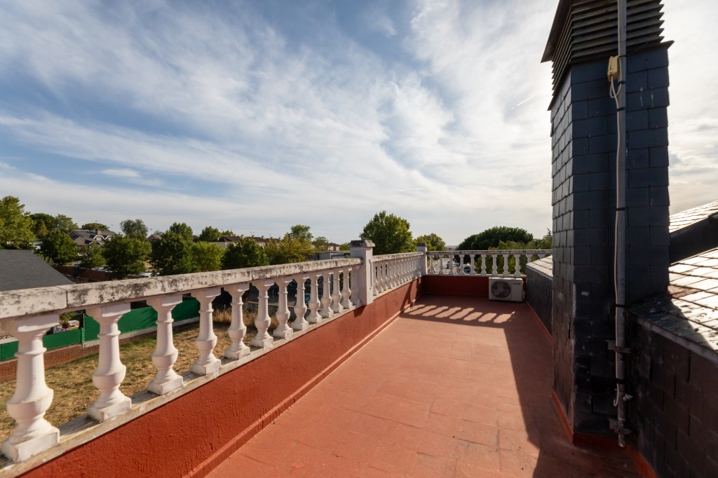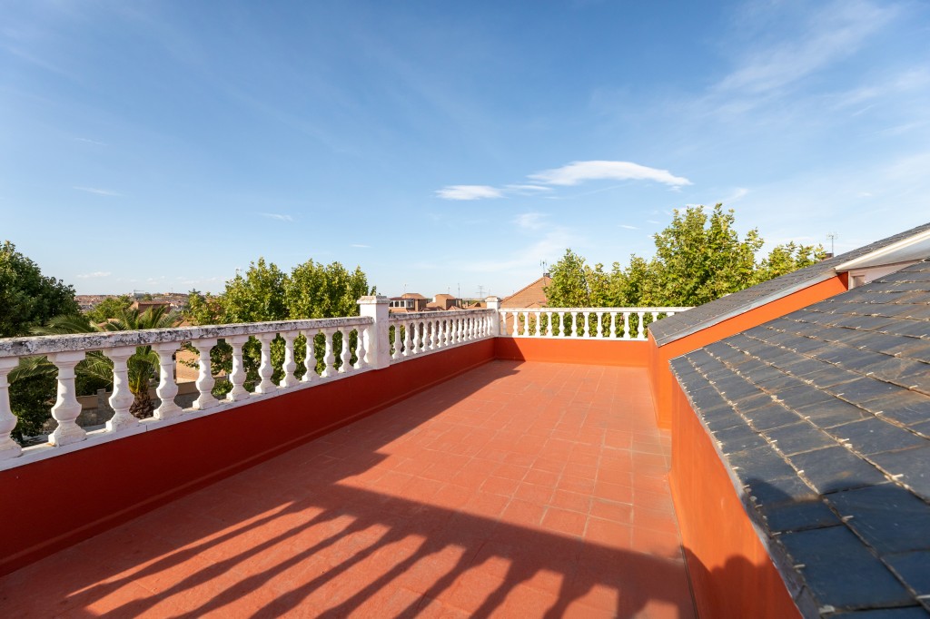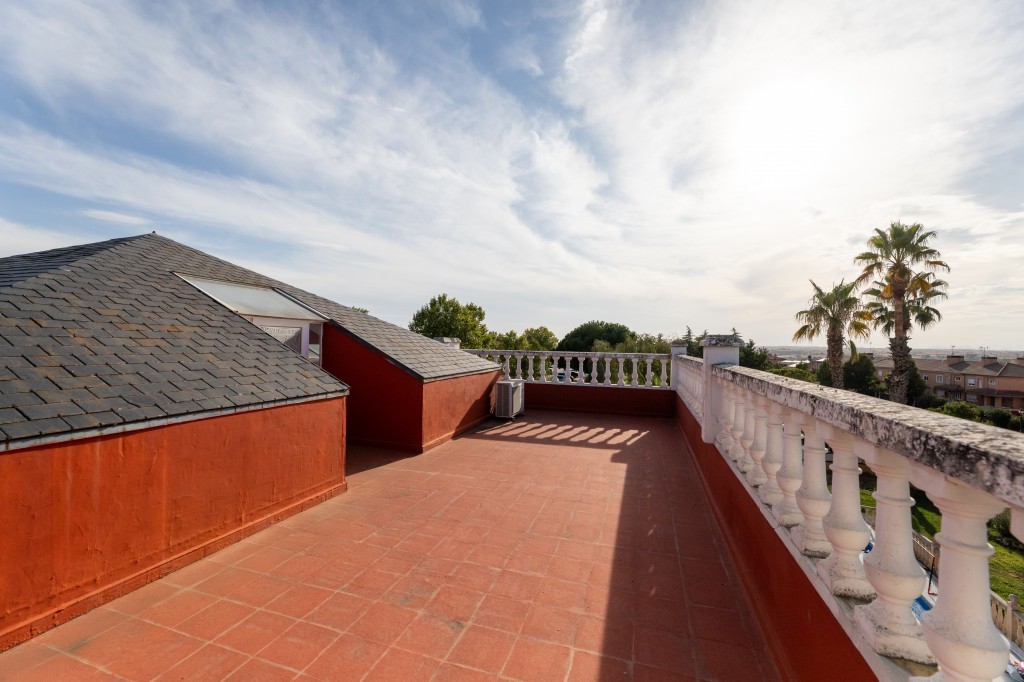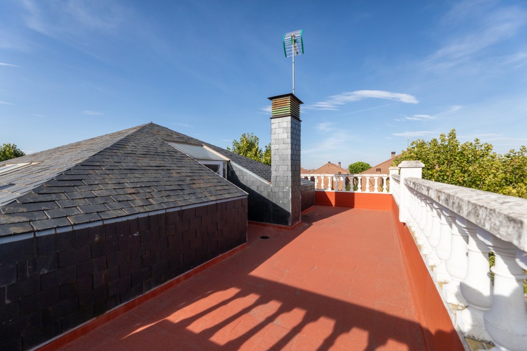 El ático abuhardillado de este chalet, con 50 m², es un espacio acogedor y versátil. Destaca por su luminosidad y acceso a dos amplias terrazas de 30 m² cada una, perfectas para disfrutar del sol en verano y crear zonas de relax al aire libre.