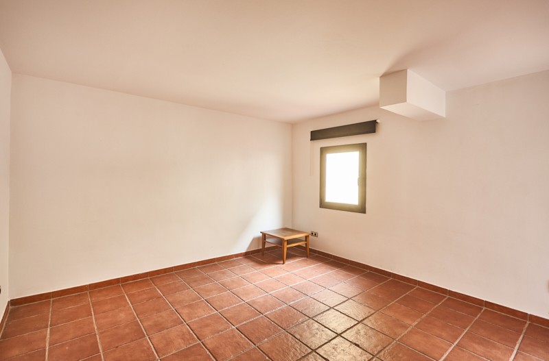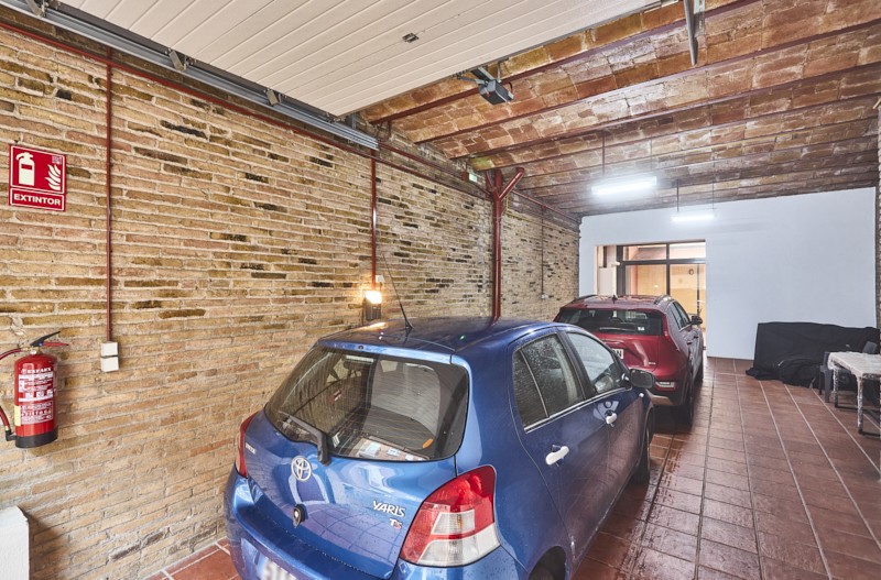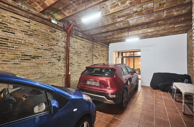 La planta baja, con acabados de obra vista y techo de revoltón original, cuenta con un gran garaje diáfano apto para varios vehículos, y motos, un aseo y cuarto auxiliar como lavadero.