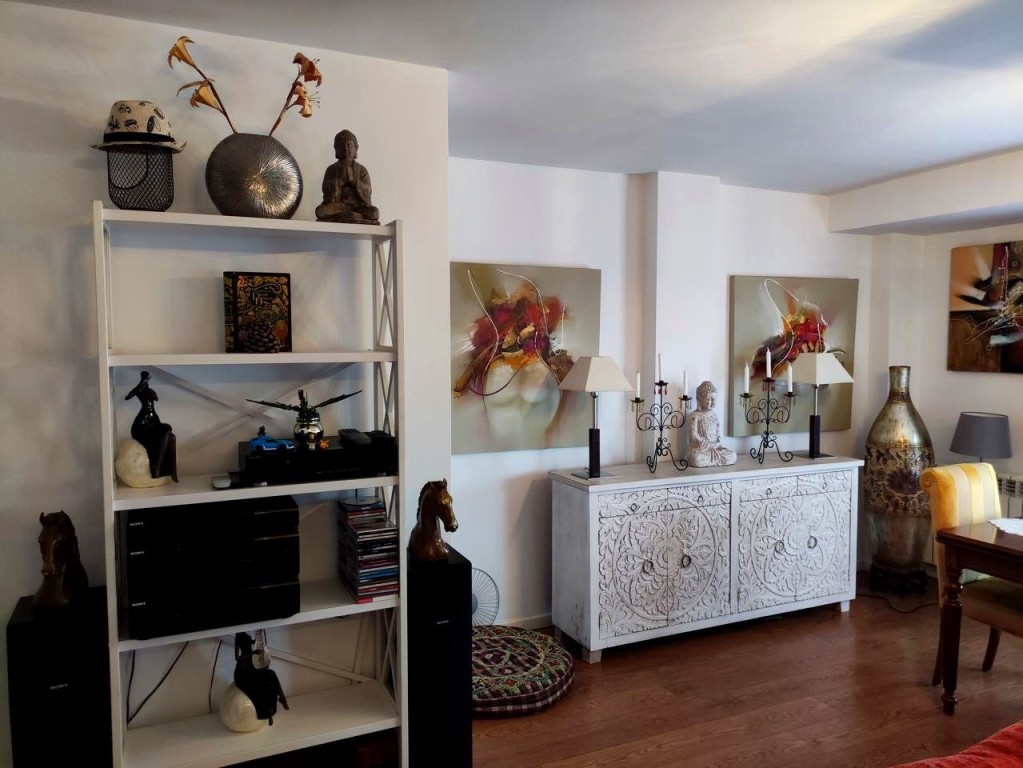 Amplio y luminoso salón rodeado por una espectacular terraza que bordea todo el lateral del edificio hasta conectar con una de las habitaciones.