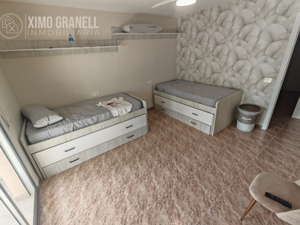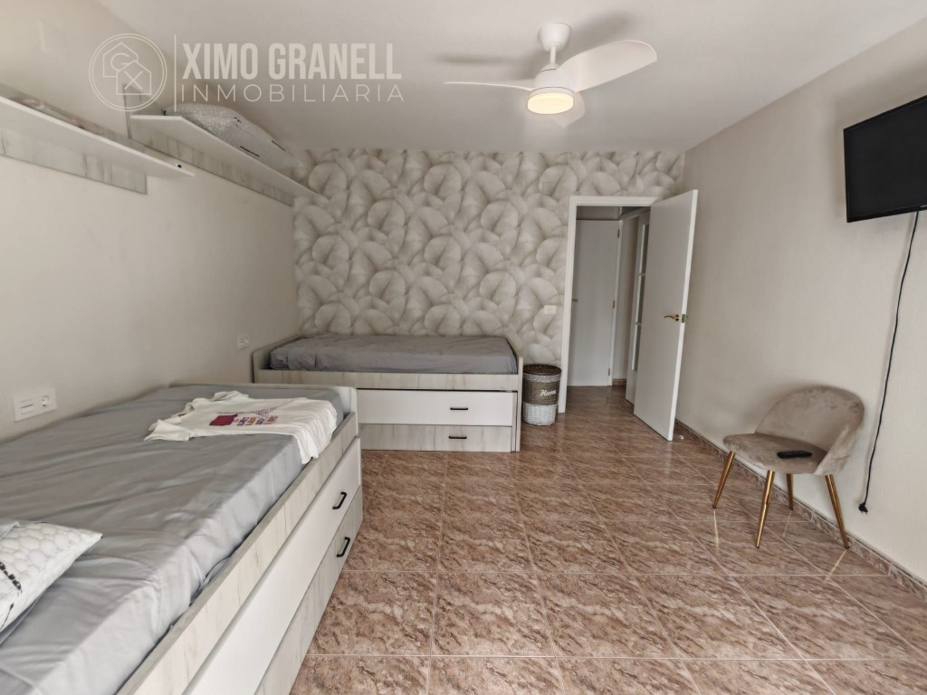 En la Planta Superior tenemos una habitación muy grande con dos camas nido, terraza exterior acristalada provista de toldos, cuarto de baño con amplio plato de ducha, habitación de matrimonio espaciosa con acceso a un balcón provisto de toldos y con una zona para tender la ropa y, finalmente, una tercera habitación también muy espaciosa con acceso a balcón.