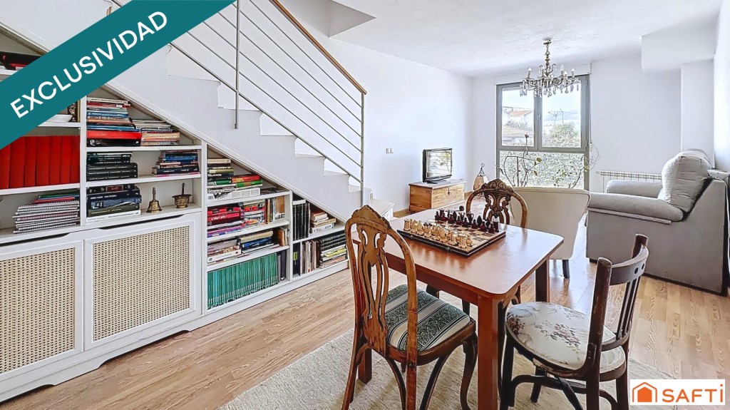 La vivienda se distribuye en dos dormitorios, un baño completo y un aseo adicional. El salón, luminoso y acogedor, es el corazón de la casa, con una librería a medida bajo la escalera que aporta carácter y funcionalidad.