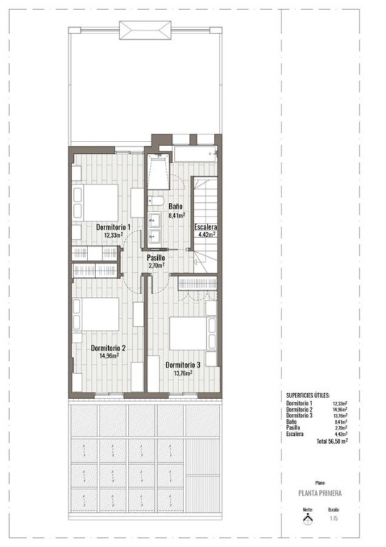 • Planta primera: 56 m². Albergando las habitaciones y zonas de descanso, con techos altos que aportan sensación de amplitud.
