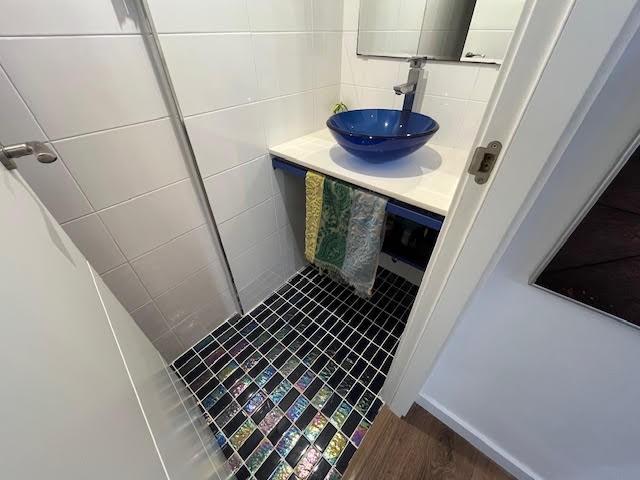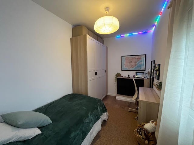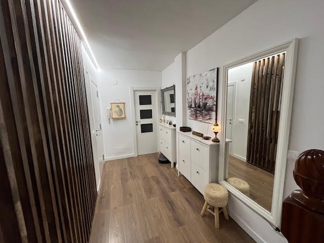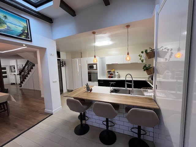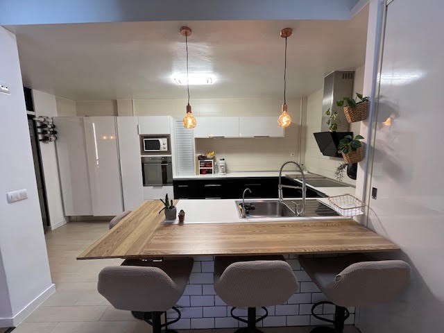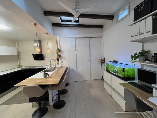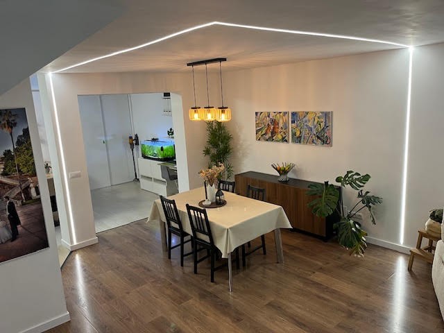 La cocina office es un verdadero sueño para los amantes de la gastronomía, ofreciendo un espacio amplio y luminoso donde preparar deliciosas comidas comunicado con el gran salón comedor, con suelo de tarima y paredes lisas, se convierte en el lugar ideal para compartir momentos inolvidables con amigos y familiares. Además, las ventanas de aluminio blanco con mosquiteras garantizan un ambiente fresco y agradable.