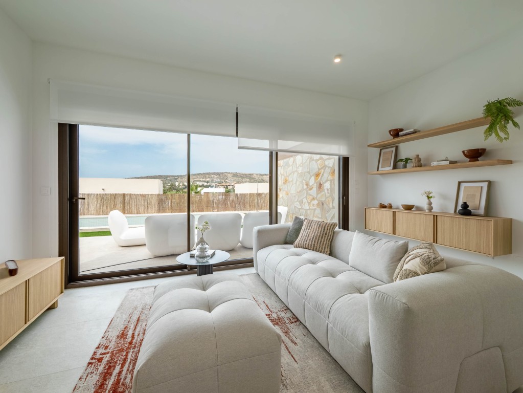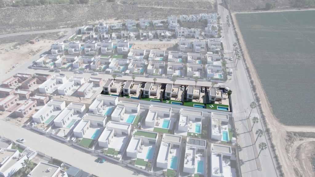 El exterior de estas viviendas independientes es simplemente espectacular. Cada propiedad cuenta con un jardín privado, perfecto para disfrutar del clima mediterráneo. Además, disponen de una terraza y un solárium, ofreciendo múltiples espacios para el relax y el entretenimiento al aire libre. La joya de la corona es la piscina privada, que añade un toque de lujo y exclusividad a cada hogar. Las persianas eléctricas y el sistema de domótica aseguran comodidad y eficiencia energética.