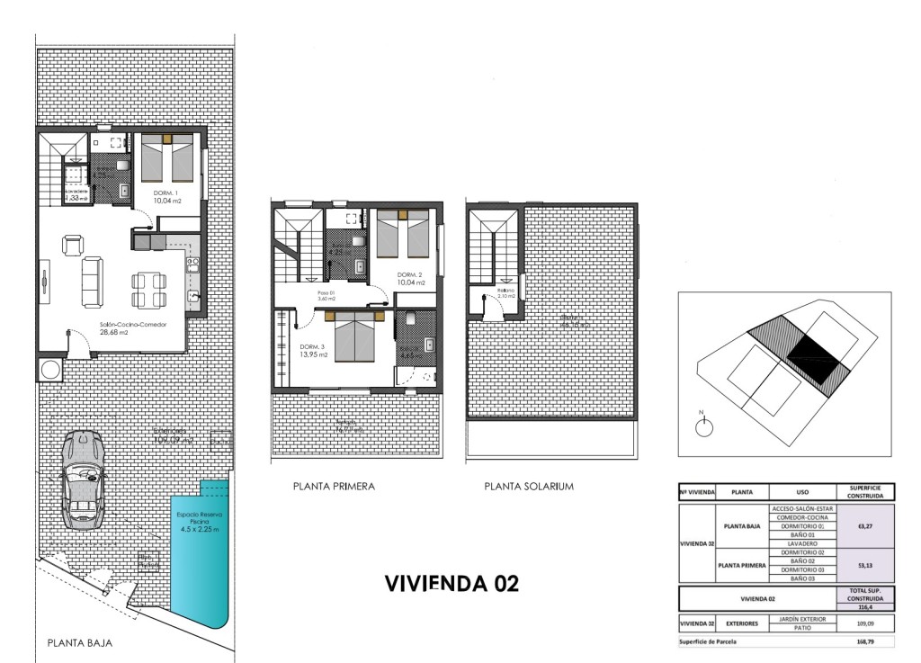 Los exteriores de estos adosados han sido cuidadosamente diseñados para maximizar el disfrute del clima mediterráneo. Cada propiedad cuenta con un jardín privado, ideal para crear un espacio verde personal o para disfrutar de momentos al aire libre con la familia y amigos. Además, las viviendas disponen de una terraza y un solárium, perfectos para tomar el sol o disfrutar de las vistas. La inclusión de una piscina privada en cada adosado añade un toque de lujo y exclusividad, permitiendo refrescarse en los días más calurosos. La cerámica utilizada en los suelos exteriores garantiza durabilidad y un mantenimiento sencillo.