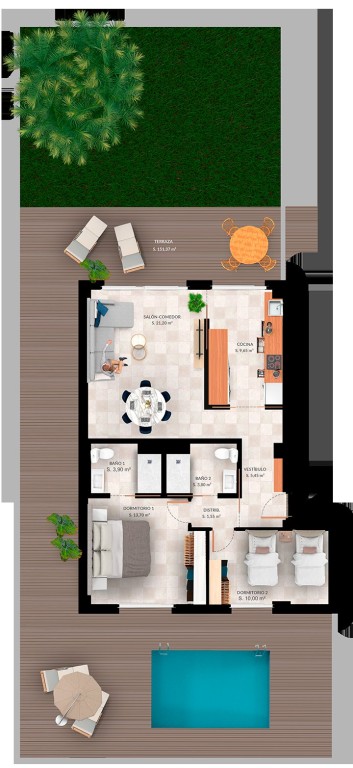 Las viviendas cuentan con características exteriores excepcionales que incluyen terrazas y solariums, perfectos para disfrutar del clima mediterráneo. Además, algunas tipologías ofrecen la opción de piscina privada, ideal para aquellos que buscan un toque adicional de exclusividad. Los jardines privados complementan estos espacios, proporcionando un entorno verde y sereno. Las persianas eléctricas y el aire acondicionado aseguran comodidad y eficiencia energética durante todo el año.