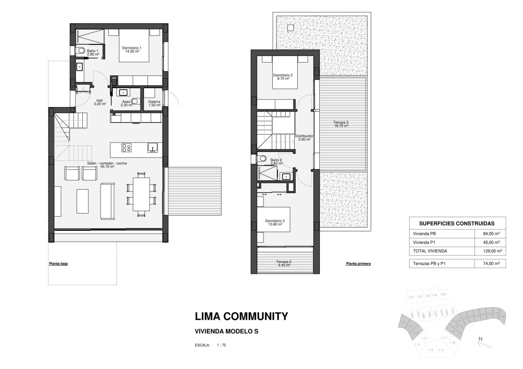 El interior de las viviendas está diseñado para ofrecer un ambiente acogedor y moderno. Cada propiedad cuenta con tres dormitorios y tres baños, proporcionando un espacio amplio y funcional para toda la familia. Los acabados de alta calidad incluyen suelos de gres porcelánico, que aportan un toque elegante y son fáciles de mantener. Las viviendas están completamente amuebladas y equipadas con electrodomésticos, asegurando que cada detalle esté cuidado para ofrecer el máximo confort. La tecnología también juega un papel importante, con características como domótica, aire acondicionado, calefacción por suelo radiante, videoportero y persianas eléctricas, que garantizan un estilo de vida moderno y eficiente. Los armarios empotrados ofrecen soluciones de almacenamiento prácticas y elegantes, completando un diseño interior que combina funcionalidad y estilo.