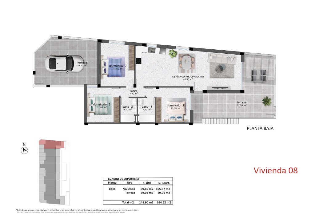 Los exteriores de estas viviendas han sido diseñados para maximizar el disfrute del clima mediterráneo. Cada bungalow cuenta con una terraza privada, perfecta para relajarse al aire libre. Además, los residentes pueden disfrutar de un solárium, ideal para tomar el sol en un entorno privado. La presencia de una pérgola proporciona sombra y confort, permitiendo el uso de los espacios exteriores durante todo el año. Las zonas ajardinadas comunitarias añaden un toque de naturaleza y tranquilidad al entorno, ofreciendo un espacio verde donde los residentes pueden pasear o simplemente disfrutar del aire libre.