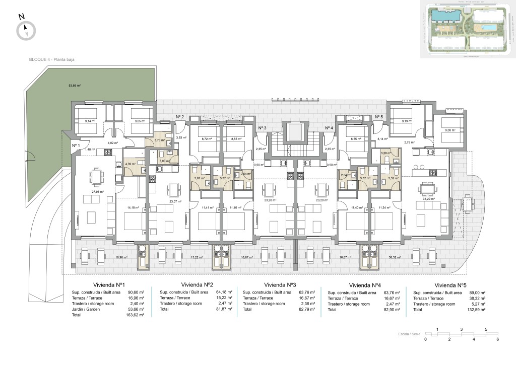 Los exteriores de estas propiedades están diseñados para maximizar el disfrute del clima mediterráneo. Cada vivienda cuenta con una terraza, ideal para relajarse al aire libre o disfrutar de comidas en familia. Además, algunas tipologías incluyen un jardín privado, proporcionando un espacio verde adicional para el ocio o la jardinería. Para aquellos que buscan vistas panorámicas, los Áticos ofrecen un solárium, perfecto para tomar el sol o contemplar el entorno. La distancia de solo 2 km hasta el mar permite disfrutar de la brisa marina y de paseos costeros en cualquier momento.