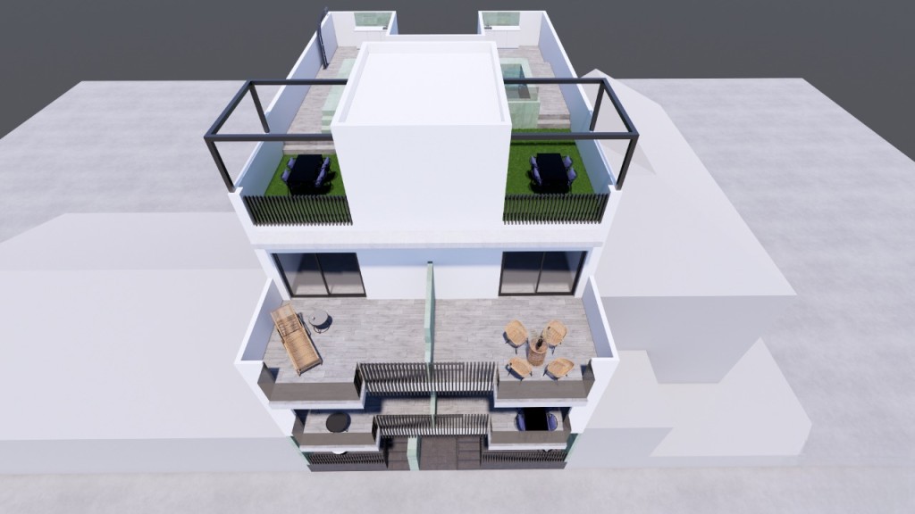 Los interiores de estas propiedades están diseñados con atención al detalle y funcionalidad. Cada apartamento y planta baja dispone de dos dormitorios y dos baños, ofreciendo un espacio cómodo y bien distribuido. Los suelos de baldosas aportan un toque moderno y son fáciles de mantener. Los armarios empotrados en los dormitorios proporcionan un amplio espacio de almacenamiento, mientras que la preinstalación de aire acondicionado asegura que el hogar esté preparado para el confort en todas las estaciones. La distribución incluye una terraza, que extiende el espacio habitable hacia el exterior, permitiendo disfrutar del clima y las vistas.