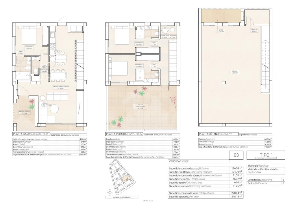 El interior de estas viviendas independientes está diseñado para ofrecer el máximo confort y funcionalidad. Con tres dormitorios y tres baños, cada hogar está preparado para satisfacer las necesidades de familias de diferentes tamaños. Los suelos de cerámica aportan un toque elegante y son fáciles de mantener, mientras que las persianas eléctricas añaden comodidad y seguridad. Las viviendas vienen completamente amuebladas, incluyendo electrodomésticos, lo que facilita la mudanza y permite disfrutar del nuevo hogar desde el primer día. Los armarios empotrados proporcionan un espacio de almacenamiento adicional, manteniendo el orden y la organización en el hogar.