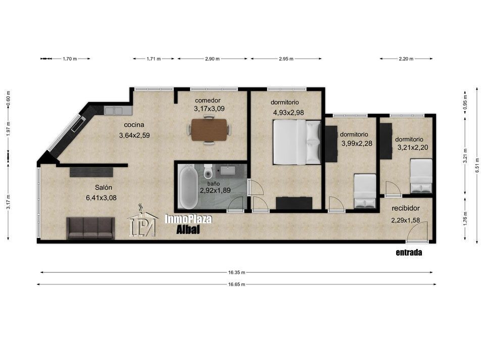 La propiedad cuenta con tres habitaciones, perfectas para adaptarlas a tus necesidades: dormitorios, despacho, vestidor o zona de invitados. Dispone de un baño completo con bañera, amplio salón-comedor con abundante entrada de luz natural y cocina independiente, que aporta comodidad y funcionalidad en el día a día.