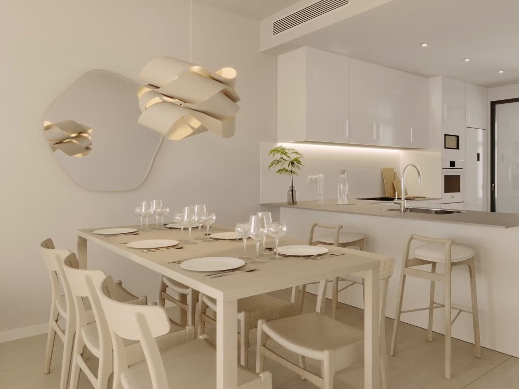El interior de las viviendas está diseñado para ofrecer el máximo confort y funcionalidad. Los suelos de gres porcelánico aportan un toque de elegancia y son fáciles de mantener. Todas las propiedades están equipadas con aire acondicionado, asegurando un ambiente agradable durante todo el año. La inclusión de electrodomésticos modernos facilita la vida diaria, mientras que los armarios empotrados ofrecen un almacenamiento eficiente y ordenado. La distribución de las viviendas está pensada para optimizar el espacio, con amplias áreas de estar que se integran perfectamente con las terrazas, creando un flujo continuo entre el interior y el exterior.