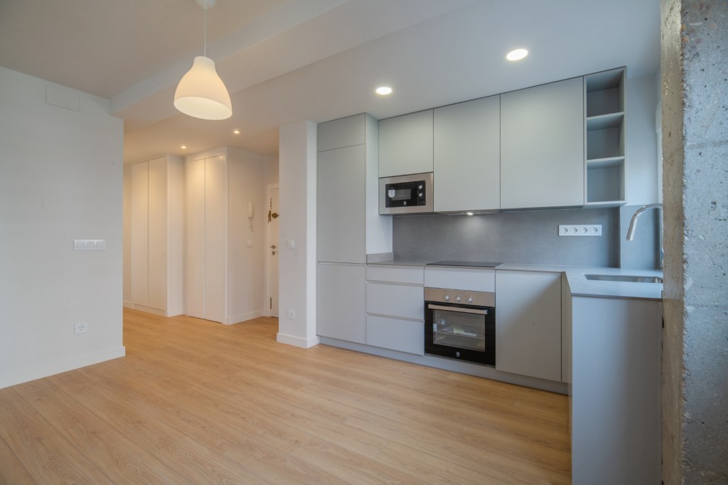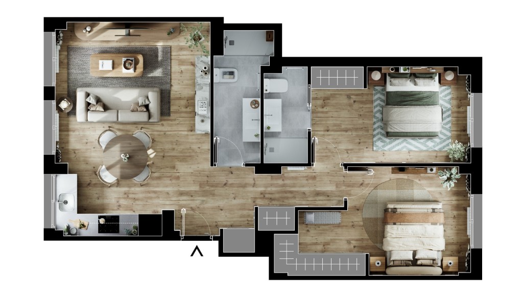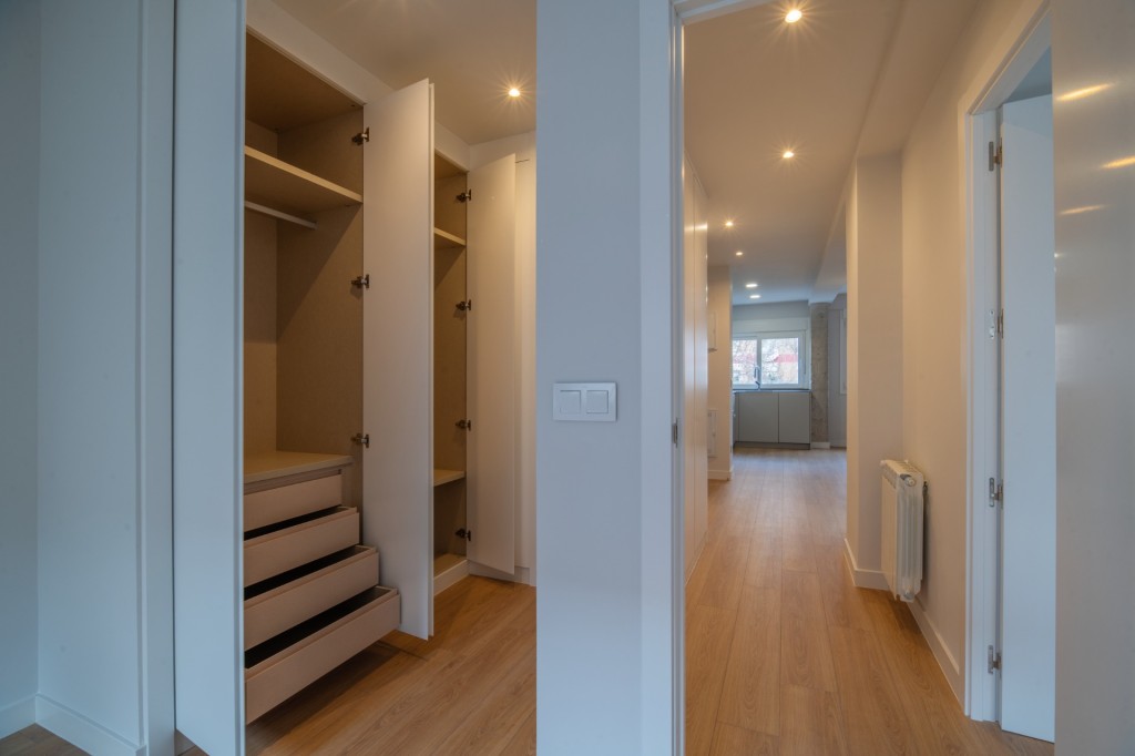 El espacio se ha optimizado en dos habitaciones amplias con armarios empotrados y dos baños completos (uno de ellos en suite). Entrando a mano izquierda se encuentra la zona de día, con salón-cocina con electrodomésticos panelados, y a mano izquierda encontramos la zona de noche. Una de las ventajas de la vivienda es su gran capacidad de almacenamiento.