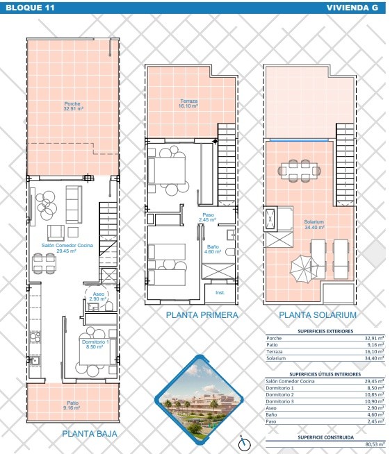 Ubicado en Pilar de la Horadada, este conjunto de 28 adosados ofrece una oportunidad única para disfrutar de la vida en la Costa Blanca. Con una distancia de solo 2 km hasta el mar, estos hogares proporcionan un acceso fácil a las playas, mientras que el aeropuerto más cercano se encuentra a 48 km, facilitando las conexiones internacionales. Los adosados están diseñados para ofrecer comodidad y funcionalidad, ideales para familias o como segunda residencia.