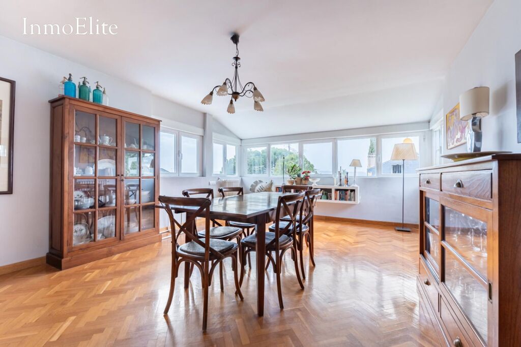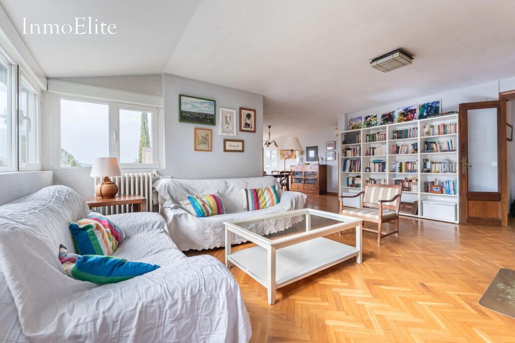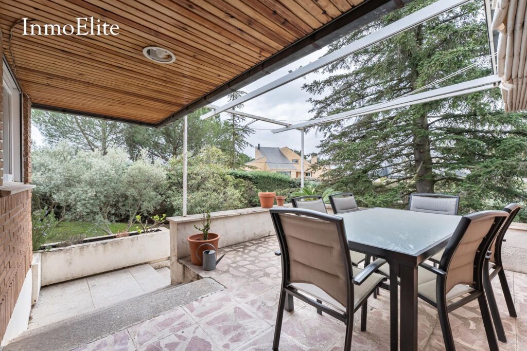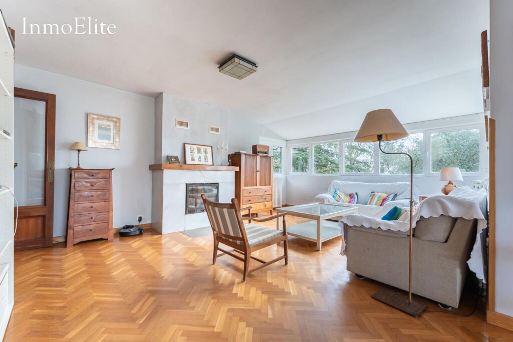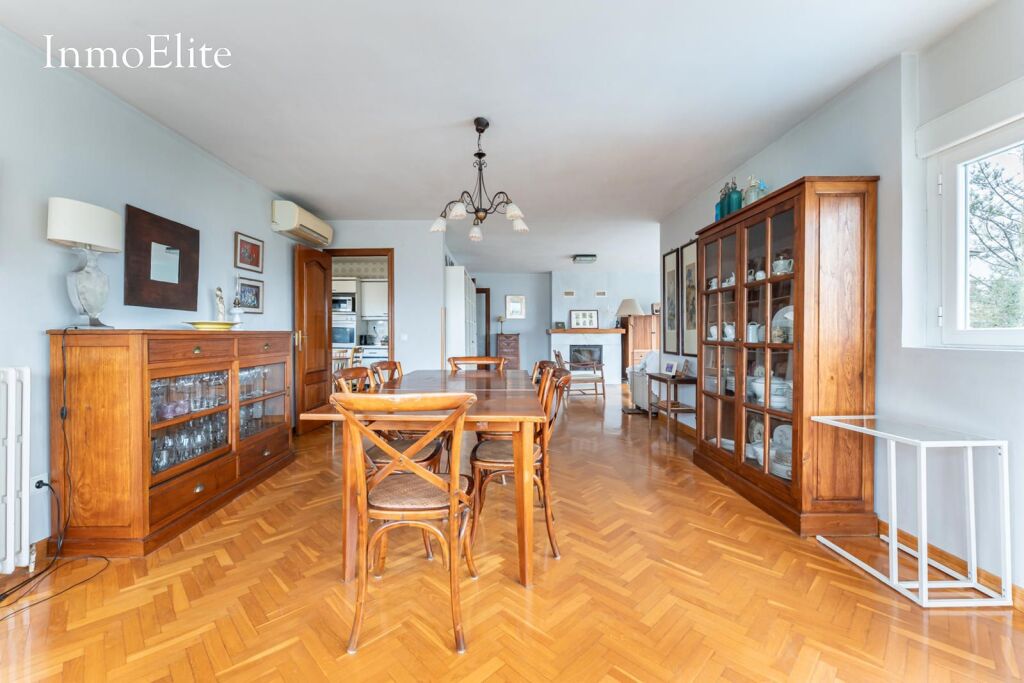 Dispone de un gran salón-comedor con chimenea que aporta calidez y unas estupendas vistas a la Sierrad de Madrid, así como cocina amueblada con office, facilitando la convivencia diaria sin perder funcionalidad.