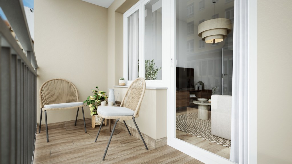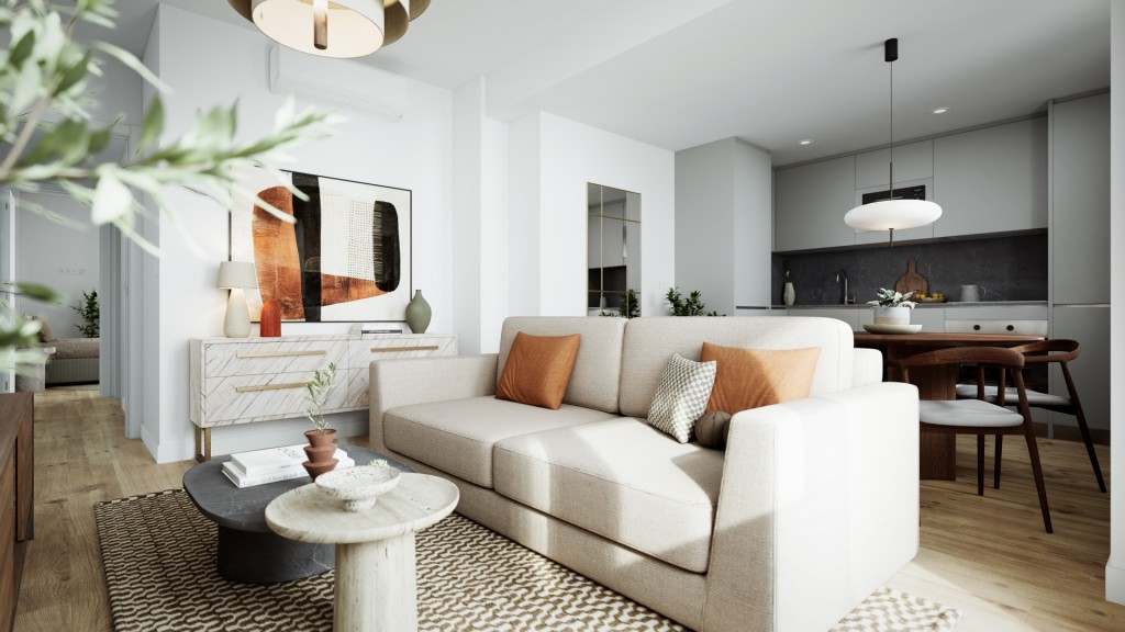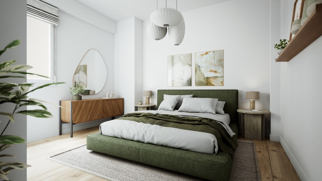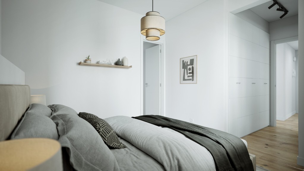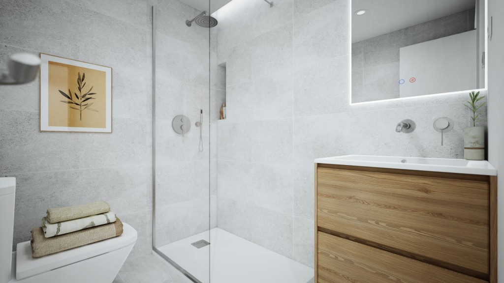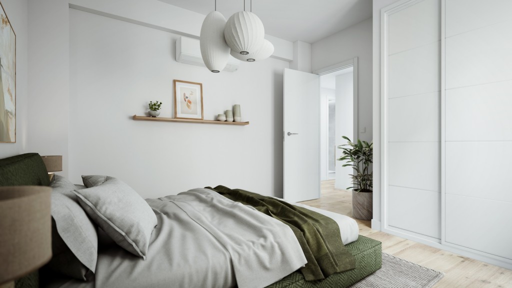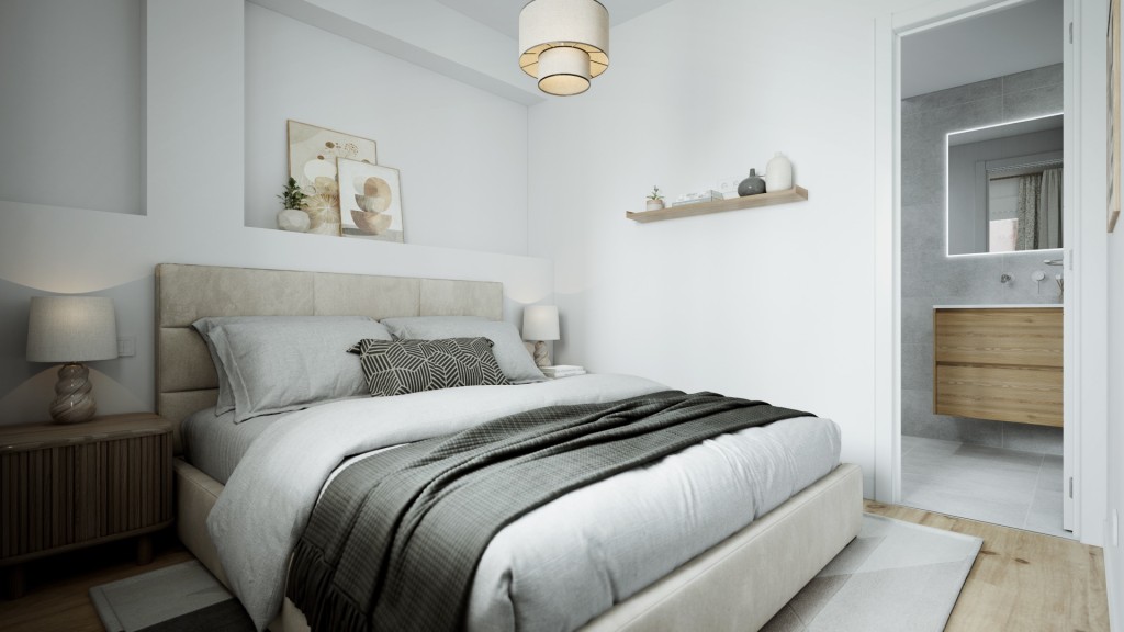 La vivienda dispondrá de tres dormitorios dobles con armarios empotrados, uno de ellos en suite, además de dos baños completos diseñados para garantizar funcionalidad y comodidad. Uno de los dormitorios tendrá acceso a una segunda terraza, favoreciendo la ventilación y aportando aún más luz natural a la vivienda.