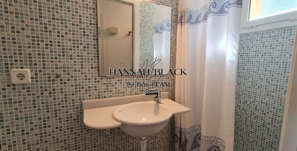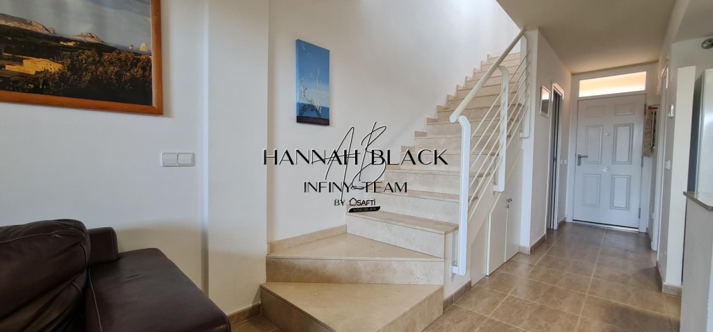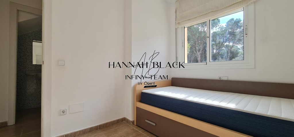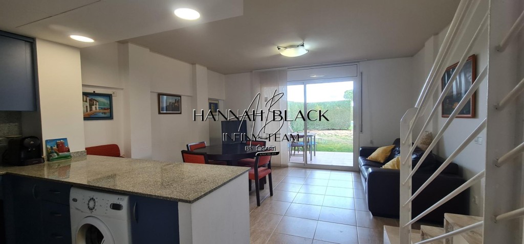 En el interior un pasillo recibidor, da paso a nuestra derecha a un baño con ducha, y a la izquierda la primera habitación. Al fondo encontramos el salón-comedor con cocina diáfana y salida al patio privado desde donde se accede a las zonas comunes con piscina, jardín, barbacoa, ...(todo muy cuidado). Mediante las escaleras poco invasivas nos trasladamos al piso superior, donde encontramos la segunda habitación, el baño con bañera de esta planta y la habitación principal con salida a terraza privada con vistas a las bonitas zonas comunes del complejo y en el horizonte mirando hacia el noroeste se puede divisar, la cordillera del sistema de los Pirineos Orientales, especialmente la zona de la Sierra de la Albera y, un poco más al oeste, las montañas que enlazan con la Sierra de Rodes.