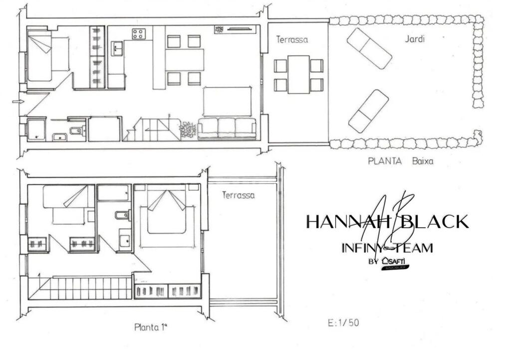 Mediante unas escaleras cómodas accedemos a la planta superior, donde se ubican una segunda habitación, un baño con bañera y la habitación principal con salida a una terraza privada con vistas a las zonas comunes del complejo. En el horizonte, orientado al noroeste, se pueden contemplar los Pirineos Orientales, destacando la Sierra de la Albera y las montañas que enlazan con la Sierra de Rodes.