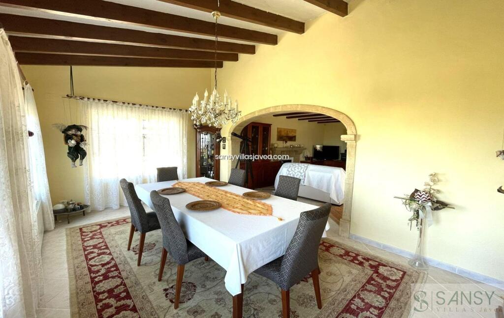 Villa 5 dormitorios, 3 baños, 1 garajes, Buen estado, en Jávea-Xàbia, Alicante Preciosa villa privada situada en La Granadella con impresionantes vistas abiertas a la montaña y al mar. Esta propiedad fue reformada en 2010 en un estilo tradicional con vigas de madera en el techo y arcos de tosca. La cocina se amplió y se abrió al salón proporcionando más amplitud y luz a la misma y a toda la casa. La cocina, totalmente equipada, cuenta también con una entrada trasera, mucho espacio de almacenamiento y un lavadero separado. El salón es amplio y luminoso y cuenta con una preciosa chimenea decorada en piedra. A través de un amplio arco de tosca se accede al gran comedor que cuenta con impresionantes vistas al mar desde las ventanas. La villa se distribuye en 2 plantas, siendo en la planta alta el salón principal y teniendo en la planta baja un apartamento independiente. En la planta superior encontramos 3 dormitorios dobles y 2 baños, siendo uno de los baños el de la habitación principal. También encontramos en esta planta una naya acristalada orientada al norte y mirando al mar que es ideal para el verano cuando el sol es demasiado caliente. También desde esta planta accedemos a un solarium muy privado con impresionantes vistas abiertas de 360º a la montaña y al mar. En la planta inferior encontramos un apartamento independiente que cuenta con una cocina totalmente equipada, un gran salón/comedor con vistas al mar, 2 dormitorios dobles, un gran baño con bañera y un lavadero/trastero separado. Este apartamento independiente es ideal para alquilarlo en vacaciones o para dar alojamiento a familiares y amigos. El exterior de la propiedad cuenta con un hermoso jardín mediterráneo de bajo mantenimiento con árboles frutales como naranjos, limoneros y nísperos que tiene un sistema de riego que utiliza el agua de un depósito de 20.000 litros que recoge el agua de la calle. La gran terraza exterior es donde encontramos la piscina de 5x12, orientada al sur/oeste y con sol casi todo el día. Desde la piscina podemos disfrutar de unas impresionantes vistas al mar. La villa también cuenta con una hermosa zona de barbacoa y un baño exterior, más fácil de acceder cuando se utiliza la piscina. La propiedad cuenta con un gran trastero subterráneo donde se encuentra la maquinaria de la piscina y también una cochera cerrada para 1 coche y aparcamiento para hasta 2 coches más. La propiedad está equipada con calefacción central con radiadores de gas. Esta hermosa propiedad está lista para ser entregada y debe ser vista para ser apreciada.