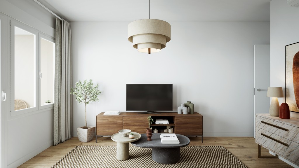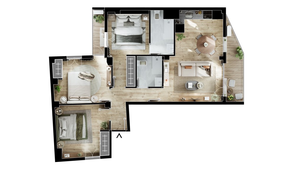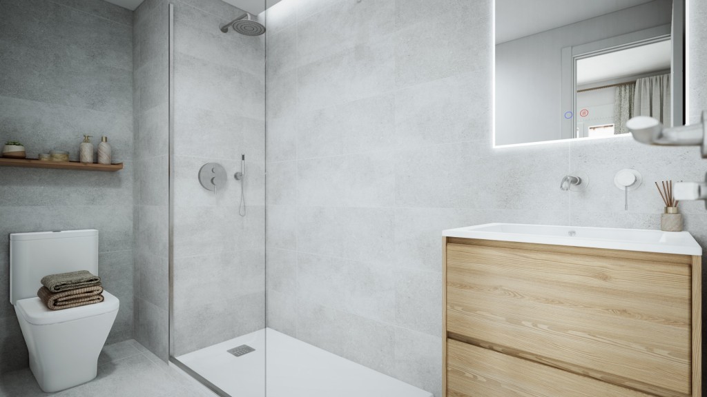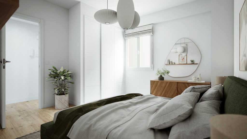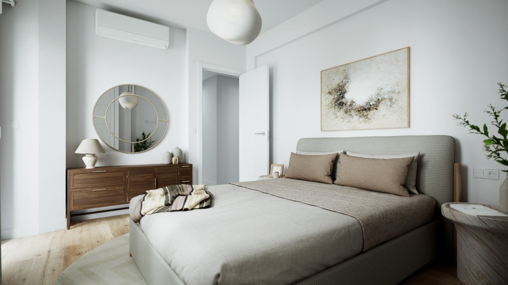La vivienda dispondrá de tres dormitorios dobles con armarios empotrados, uno de ellos en suite, además de dos baños completos diseñados para garantizar funcionalidad y comodidad. Uno de los dormitorios tendrá acceso a una segunda terraza, favoreciendo la ventilación y aportando aún más luz natural a la vivienda.