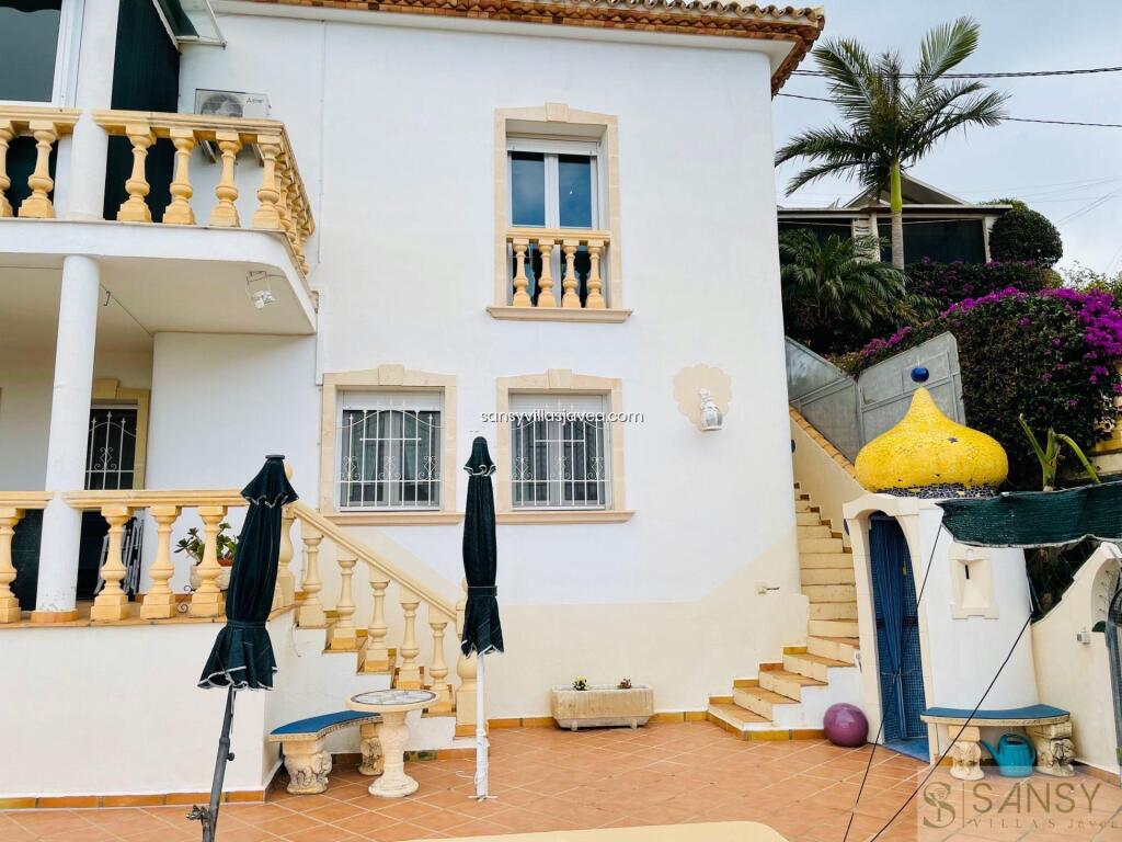Villa 4 dormitorios, 4 baños, 0 garajes, Buen estado, en Dénia, Alicante Este Chalet se encunetra en una buena zona residencial de Denia con muy buenas vistas al mar y panoramicas. Se destribuye en tres pantas , con amplio salon/ comedor con salida a una terraza acristalada donde se aprecia las vistas . La cocina es abierta y estar equipada, 4 dormitorios con armarios empotrados , 4 baños dos de ellos on suite , 1 aseo. Apartamento de invitados con acceso des de la casa. Piscina climatizada por placas solar, jardin de facil mantenimiento. Sala de juego y 3 trasteros , la casa se encuentra en perfecto estado