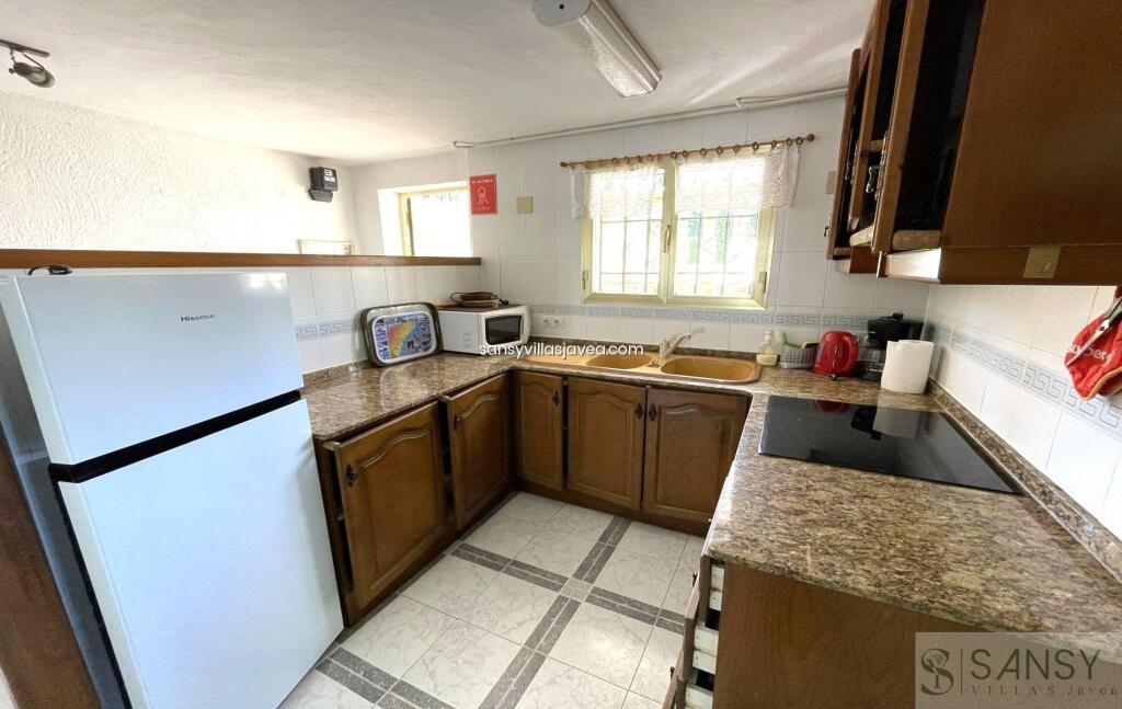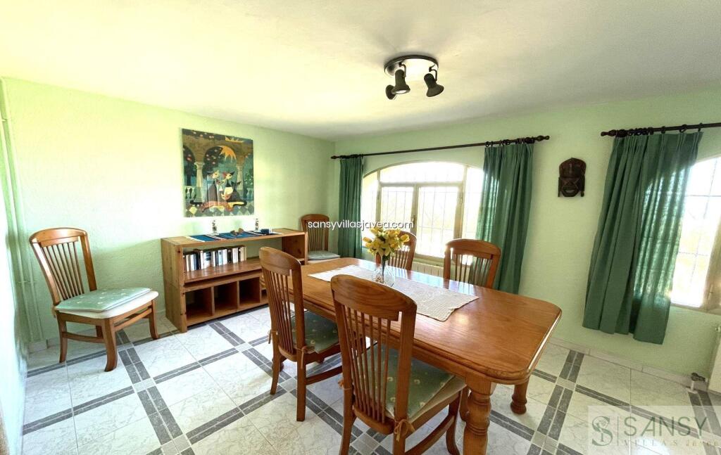 Villa 5 dormitorios, 3 baños, 1 garajes, Buen estado, en Jávea-Xàbia, Alicante Preciosa villa privada situada en La Granadella con impresionantes vistas abiertas a la montaña y al mar. Esta propiedad fue reformada en 2010 en un estilo tradicional con vigas de madera en el techo y arcos de tosca. La cocina se amplió y se abrió al salón proporcionando más amplitud y luz a la misma y a toda la casa. La cocina, totalmente equipada, cuenta también con una entrada trasera, mucho espacio de almacenamiento y un lavadero separado. El salón es amplio y luminoso y cuenta con una preciosa chimenea decorada en piedra. A través de un amplio arco de tosca se accede al gran comedor que cuenta con impresionantes vistas al mar desde las ventanas. La villa se distribuye en 2 plantas, siendo en la planta alta el salón principal y teniendo en la planta baja un apartamento independiente. En la planta superior encontramos 3 dormitorios dobles y 2 baños, siendo uno de los baños el de la habitación principal. También encontramos en esta planta una naya acristalada orientada al norte y mirando al mar que es ideal para el verano cuando el sol es demasiado caliente. También desde esta planta accedemos a un solarium muy privado con impresionantes vistas abiertas de 360º a la montaña y al mar. En la planta inferior encontramos un apartamento independiente que cuenta con una cocina totalmente equipada, un gran salón/comedor con vistas al mar, 2 dormitorios dobles, un gran baño con bañera y un lavadero/trastero separado. Este apartamento independiente es ideal para alquilarlo en vacaciones o para dar alojamiento a familiares y amigos. El exterior de la propiedad cuenta con un hermoso jardín mediterráneo de bajo mantenimiento con árboles frutales como naranjos, limoneros y nísperos que tiene un sistema de riego que utiliza el agua de un depósito de 20.000 litros que recoge el agua de la calle. La gran terraza exterior es donde encontramos la piscina de 5x12, orientada al sur/oeste y con sol casi todo el día. Desde la piscina podemos disfrutar de unas impresionantes vistas al mar. La villa también cuenta con una hermosa zona de barbacoa y un baño exterior, más fácil de acceder cuando se utiliza la piscina. La propiedad cuenta con un gran trastero subterráneo donde se encuentra la maquinaria de la piscina y también una cochera cerrada para 1 coche y aparcamiento para hasta 2 coches más. La propiedad está equipada con calefacción central con radiadores de gas. Esta hermosa propiedad está lista para ser entregada y debe ser vista para ser apreciada.
