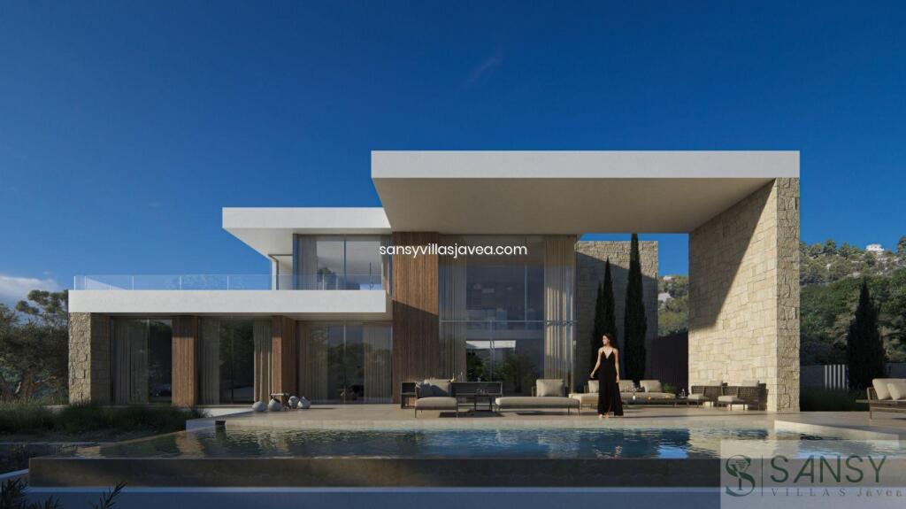 Villa 4 dormitorios, 5 baños, 0 garajes, Buen estado, en Teulada, Alicante Chalet moderno de obra nueva en venta en Moraira. Este chalet que estará finalizado a mediados de 2025 se construye sobre una parcela de 1.601m².Situado en lo alto de una colina, domina las vistas sobre todo su entorno.Se ha cuidado mucho el diseño y los materiales. La viviendase distribuye en 3 plantas de un total de 350m² conectadas por un ascensor.Laplanta baja es diáfanae integra el salón-comedor, unacocina equipada con eletrodomésticos de alta calidad y 3 dormitorios con baño en-suite. En esta planta también se encuentra la terraza con piscina infinitay una pérgola.La planta alta es única y exclusivamente para el dormitorio principal. En la planta semi-sótano se encuentra el garage de 51 m² con acceso exterior e interior por escaleras y ascensor. En este nivel también hay dos cuartos,para la depuradora y el local técnico.