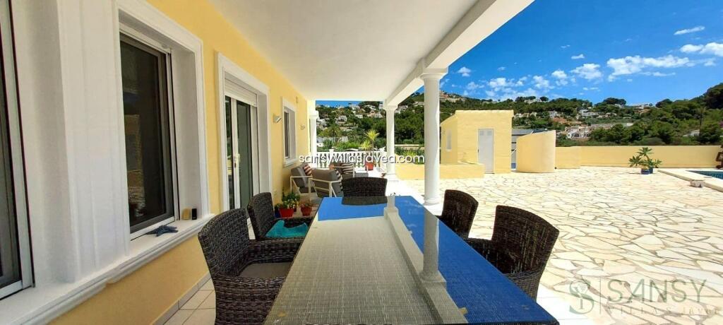 Villa 6 dormitorios, 4 baños, 1 garajes, Buen estado, en Moraira, Alicante Bonita moderna orientación sur con un apartamento independiente de dos dormitorios ubicado en el atractivo barrio de Sol Park, Moraira. Se accede a la villa a través de la puerta de entrada al hall de entrada. Arriba al primer piso, lo lleva al dormitorio principal con aire acondicionado empotrado, vestidor y baño en suite. También hay acceso a un gran balcón/terraza privada con una pequeña vista al mar. En la planta baja encontrará la cocina/comedor de planta abierta con acceso de doble puerta a la terraza cubierta, con comedor exterior y sala de estar. Justo al lado del comedor está el salón con sofá, sillas, televisión y aire acondicionado. También en este nivel hay un gran dormitorio (que tiene la posibilidad de convertirse en 2 dormitorios), actualmente acondicionado como dormitorio y 2º salón dividido por armarios altos. Hay un baño situado frente al dormitorio. En la planta baja se encuentran el 2 dormitorios ambos dobles y armarios empotrados , con aire acondicionado y compartiendo el baño grande. El apartamento se encuentra en planta semisótano con acceso propio desde la zona de aparcamiento. El apartamento tiene un salón/cocina, lavadero, baño y 2 habitaciones dobles. El salón y 1 dormitorio cuentan con aire acondicionado. En el exterior hay aparcamiento para 3 o 4 coches con puerta automática y puerta peatonal separada al lado. Hay una gran piscina/solárium con orientación sur abierta, piscina de 10 x 4 m, aseo y ducha solar y barbacoa de obra. El resto de los terrenos están hechos a un estilo de jardín mediterráneo con árboles frutales y palmeras.