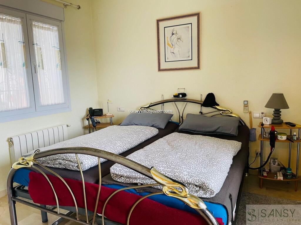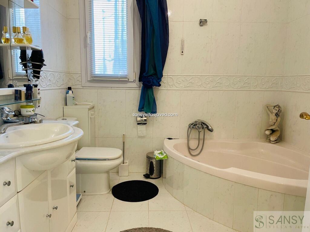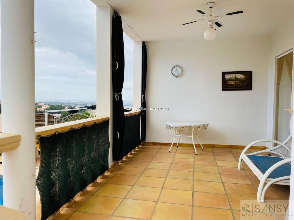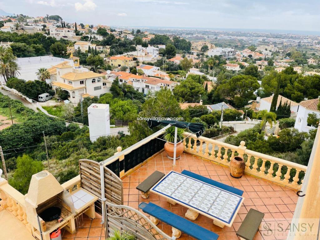 Villa 4 dormitorios, 4 baños, 0 garajes, Buen estado, en Dénia, Alicante Este Chalet se encunetra en una buena zona residencial de Denia con muy buenas vistas al mar y panoramicas. Se destribuye en tres pantas , con amplio salon/ comedor con salida a una terraza acristalada donde se aprecia las vistas . La cocina es abierta y estar equipada, 4 dormitorios con armarios empotrados , 4 baños dos de ellos on suite , 1 aseo. Apartamento de invitados con acceso des de la casa. Piscina climatizada por placas solar, jardin de facil mantenimiento. Sala de juego y 3 trasteros , la casa se encuentra en perfecto estado