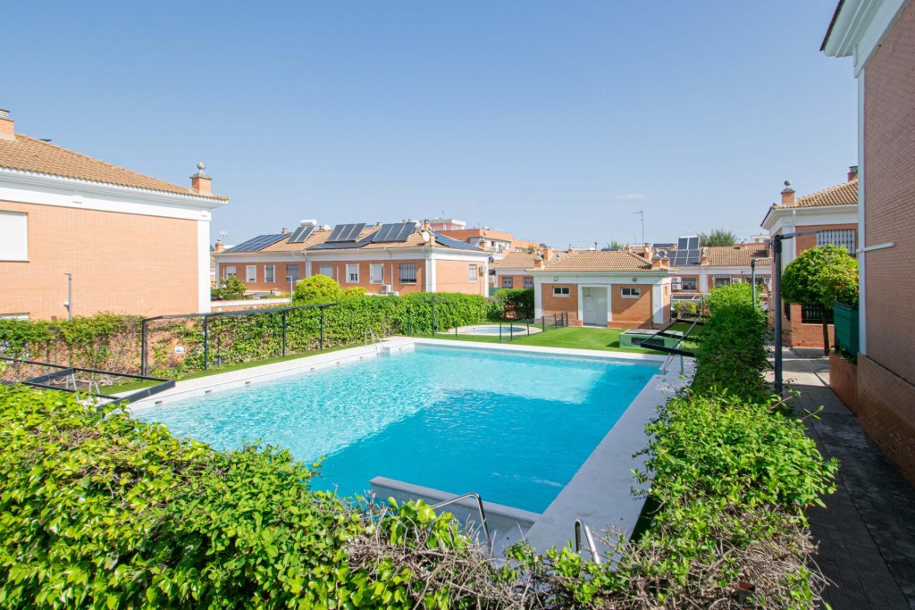 Se ofrece en venta un bonito adosado ubicado en la urbanización Las Lomas cerca de la parada del METRO. La vivienda cuenta con una superficie útil de noventa metros cuadrados distribuidos en dos plantas, con orientación Sur-Norte con lo cual ofrece una magnifica ventilación cruzada, además de patio delantero y trasero que permiten disfrutar de espacios exteriores privados.En la planta baja, encontramos un amplio salón independiente que ofrece agradables vistas al patio delantero, proporcionando un ambiente luminoso y acogedor, también dispone de un cómodo dormitorio o despacho. La cocina amueblada y presenta acceso directo al patio trasero, ideal para actividades al aire libre o momentos de descanso. También en esta planta se dispone un aseo para mayor comodidad.La planta superior alberga tres habitaciones, la principal dispone del baño en suite, lo que brinda privacidad y confort adicional. Asimismo, cuenta con otro baño completo que facilitan el uso diario para toda la familia.La urbanización ofrece zonas comunes perfectamente cuidadas, incluyendo una piscina comunitaria. Además, la propiedad dispone de un garaje situado en la planta baja, proporcionando seguridad y comodidad para el estacionamiento de vehículos.Su ubicación es otro punto destacable, encontrándose junto a un centro deportivo y próxima a tiendas y paradas de autobuses, lo que garantiza una excelente comunicación y accesibilidad a los servicios necesarios.V.P.O numero de expediente 41.1.0189/95En cumplimiento de las obligaciones de información previstas Disp. final 3ª de la Ley 10/2025, de 28 de diciembre, de servicios de atención a la clientela y transparencia, así como en la normativa sectorial vigente, y RD 218/2005 de Inf. de la Junta de Andalucía, el precio indicado no incluye los gastos e impuestos inherentes a la adquisición, los cuales se desglosan estimados o con posibilidad de calcularlos a continuación; los gastos más ajustados serán dados en el D.I.A./F.I.S. en la visita a inmuebles, o antes.*Gastos de Notaría: La Minuta se calculará según al arancel notarial oficial: Anexo I, del Real Decreto 1426/1989, de 17 de noviembre del portal del Notariado. Enlace: https://notariared.com/calculadora-gastos-compra-vivienda/*Gastos de Registro de la Propiedad: La inscripción se facturará según el arancel oficial: ANEXO I, del Real Decreto 1427/1989, de 17 de noviembre. Igual enlace anterior*Gastos de Gestión (Gestoría): Los honorarios por la tramitación administrativa, liquidación de impuestos e inscripción registral ascienden de forma estimativa a [363 € aprox.] (IVA incluido), aunque depende de cada caso, y su dificultad.*Honorarios Agencia del Vendedor: incluidos en el PVP.*Honorarios Agencia del Comprador: 3% + IVA (21%) no incluido en el PVP. - La agencia prestará los servicios de mediación, asesoramiento y acompañamiento previstos en el Contrato de Prestación de Servicios y en el D.I.A./F.I.S. Si solicita servicios adicionales o personalizados, sus honorarios serán informados previamente, de forma individualizada y por escrito, conforme a la libertad de pactos y a la normativa vigente.*Si necesita Financiación: su banco le informará*Impuesto sobre Transmisiones Patrimoniales (ITP): Se aplicará el tipo impositivo vigente en Andalucía (generalmente el 7%, sin perjuicio de tipos reducidos del 6%. 3,5%, etc, aplicables según las circunstancias personales del comprador o las características del inmueble). El impuesto se devenga sobre el superior entre: 1.- Valor de Referencia de Catastro; y 2.- Precio de venta. Puede calcular su situación personal en el portal oficial de la A.T. de Andalucía. Enlace: https://www.juntadeandalucia.es/organismos/economiahaciendayfondoseuropeos/areas/tributos-juego/tributos/paginas/impuestos-cedidos-transmisiones.html