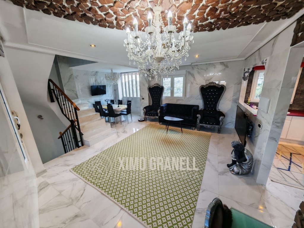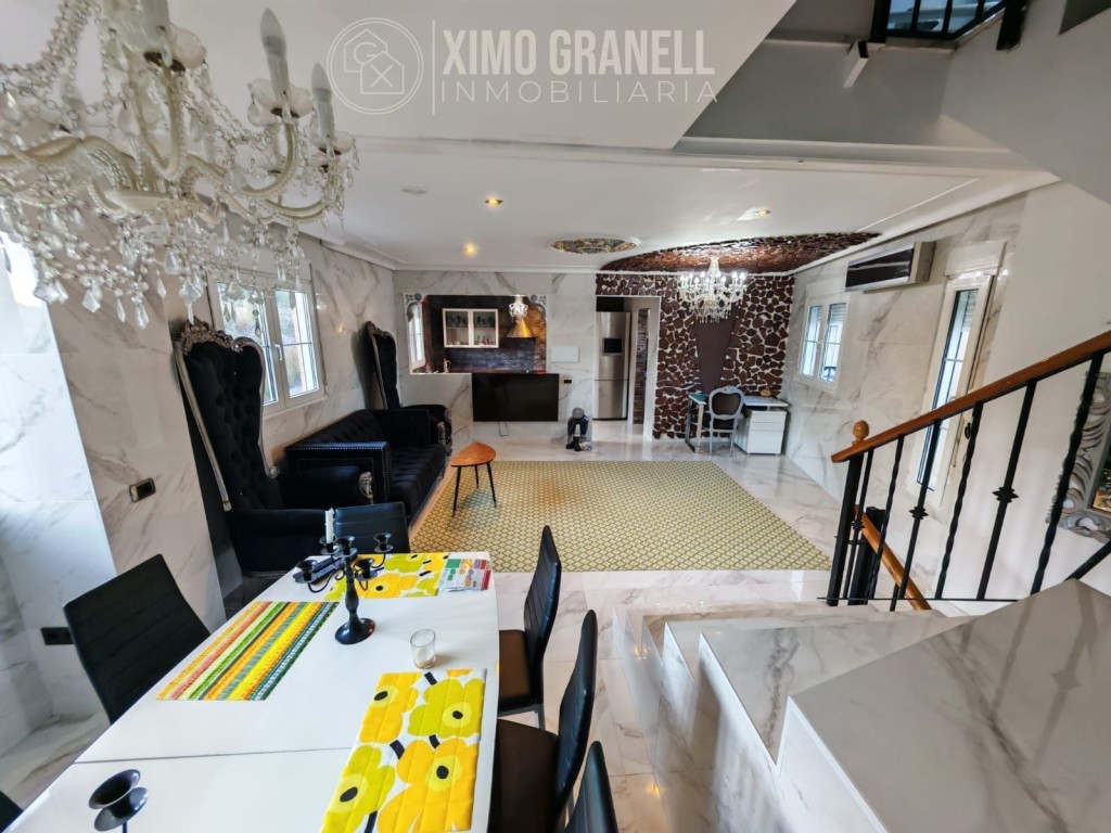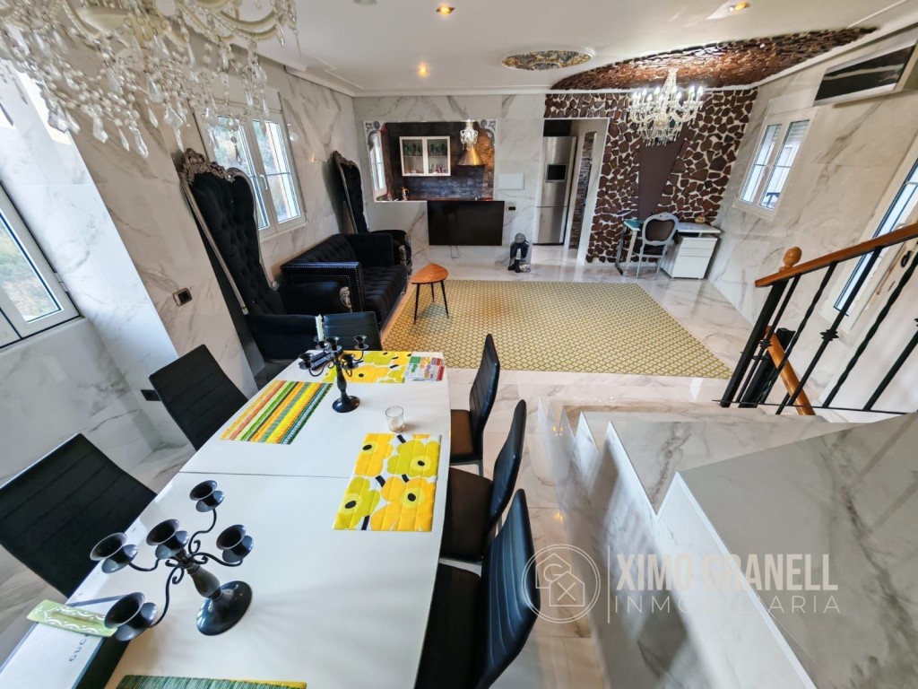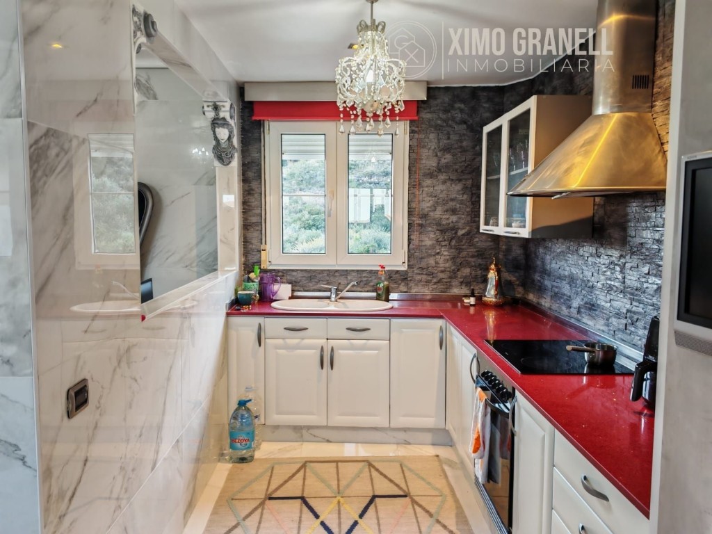 Consta la Planta Baja de amplio recibidor, escaleras de porcelánico, mármol de calacatta en suelos y paredes del salón-comedor, cocina independiente parcialmente abierta al Amplio salón con muchísima luz, ya que tiene ventanas en los dos laterales con pared de piedra, Galería-lavadero con Cocinita auxiliar de gas butano integrada con ventana. Totalmente exterior. Encimera de vitrocerámica, horno eléctrico y termo de butano.