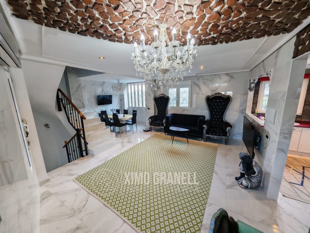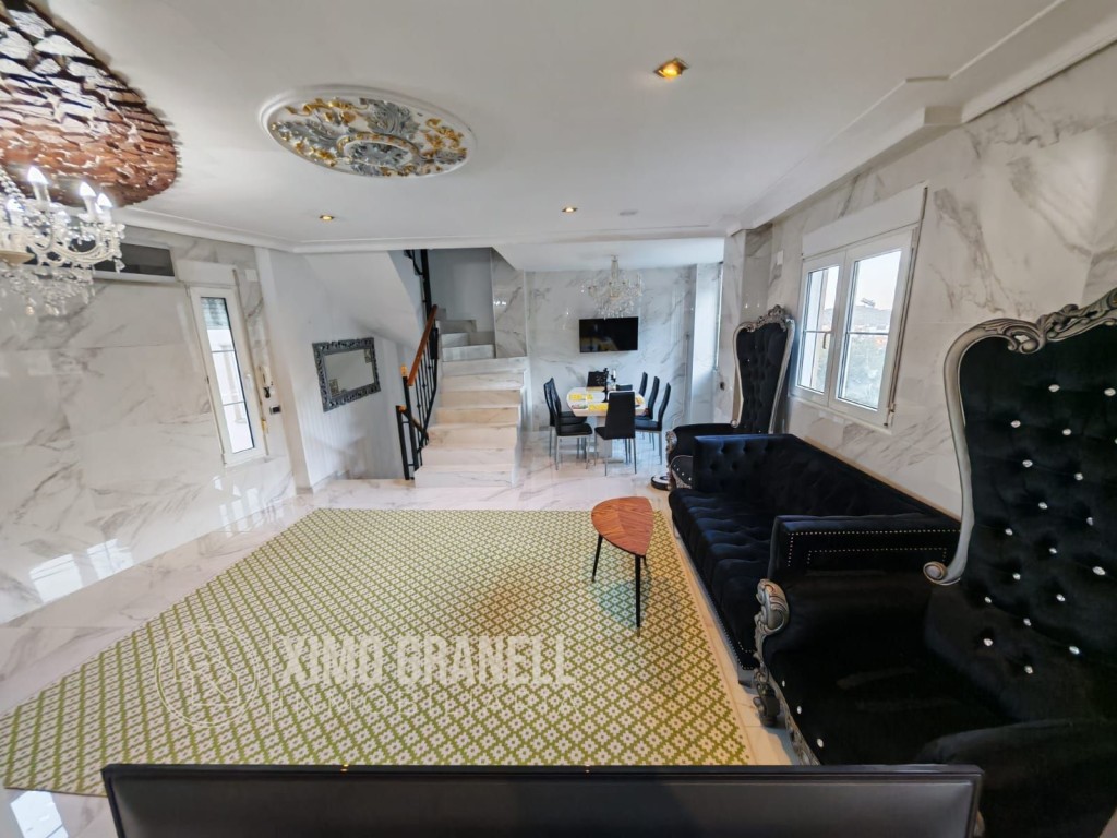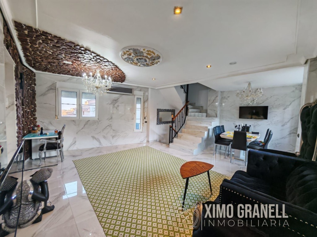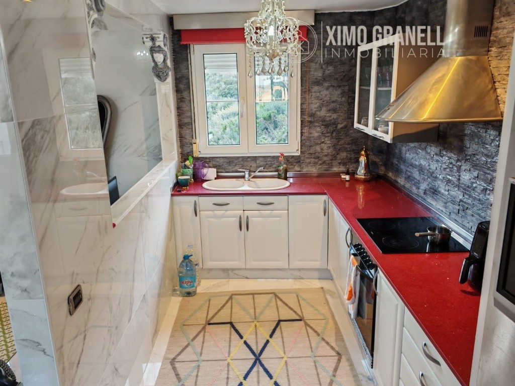 Consta la Planta Baja de amplio recibidor, escaleras de porcelánico, mármol de calacatta en suelos y paredes del salón-comedor, cocina independiente parcialmente abierta al Amplio salón con muchísima luz, ya que tiene ventanas en los dos laterales con pared de piedra, Galería-lavadero con Cocinita auxiliar de gas butano integrada con ventana. Totalmente exterior. Encimera de vitrocerámica, horno eléctrico y termo de butano.