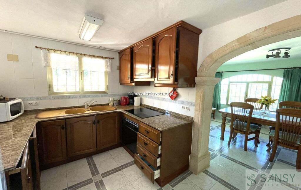 Villa 5 dormitorios, 3 baños, 1 garajes, Buen estado, en Jávea-Xàbia, Alicante Preciosa villa privada situada en La Granadella con impresionantes vistas abiertas a la montaña y al mar. Esta propiedad fue reformada en 2010 en un estilo tradicional con vigas de madera en el techo y arcos de tosca. La cocina se amplió y se abrió al salón proporcionando más amplitud y luz a la misma y a toda la casa. La cocina, totalmente equipada, cuenta también con una entrada trasera, mucho espacio de almacenamiento y un lavadero separado. El salón es amplio y luminoso y cuenta con una preciosa chimenea decorada en piedra. A través de un amplio arco de tosca se accede al gran comedor que cuenta con impresionantes vistas al mar desde las ventanas. La villa se distribuye en 2 plantas, siendo en la planta alta el salón principal y teniendo en la planta baja un apartamento independiente. En la planta superior encontramos 3 dormitorios dobles y 2 baños, siendo uno de los baños el de la habitación principal. También encontramos en esta planta una naya acristalada orientada al norte y mirando al mar que es ideal para el verano cuando el sol es demasiado caliente. También desde esta planta accedemos a un solarium muy privado con impresionantes vistas abiertas de 360º a la montaña y al mar. En la planta inferior encontramos un apartamento independiente que cuenta con una cocina totalmente equipada, un gran salón/comedor con vistas al mar, 2 dormitorios dobles, un gran baño con bañera y un lavadero/trastero separado. Este apartamento independiente es ideal para alquilarlo en vacaciones o para dar alojamiento a familiares y amigos. El exterior de la propiedad cuenta con un hermoso jardín mediterráneo de bajo mantenimiento con árboles frutales como naranjos, limoneros y nísperos que tiene un sistema de riego que utiliza el agua de un depósito de 20.000 litros que recoge el agua de la calle. La gran terraza exterior es donde encontramos la piscina de 5x12, orientada al sur/oeste y con sol casi todo el día. Desde la piscina podemos disfrutar de unas impresionantes vistas al mar. La villa también cuenta con una hermosa zona de barbacoa y un baño exterior, más fácil de acceder cuando se utiliza la piscina. La propiedad cuenta con un gran trastero subterráneo donde se encuentra la maquinaria de la piscina y también una cochera cerrada para 1 coche y aparcamiento para hasta 2 coches más. La propiedad está equipada con calefacción central con radiadores de gas. Esta hermosa propiedad está lista para ser entregada y debe ser vista para ser apreciada.