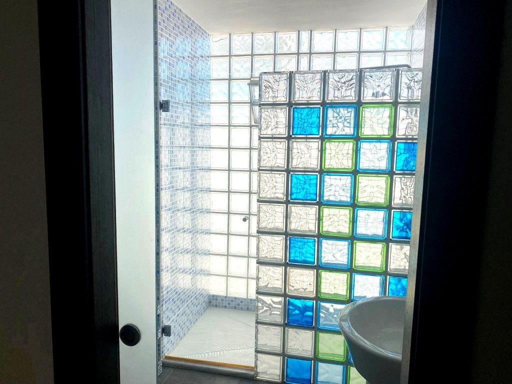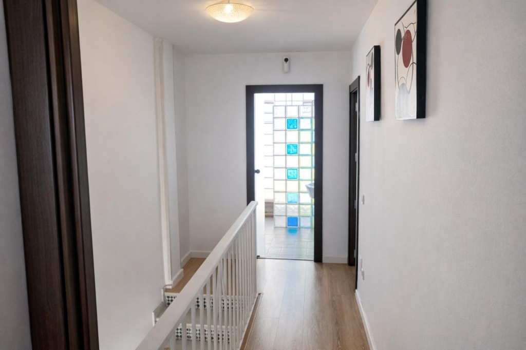 La luz es la gran protagonista. No entra… se queda. Una pared de pavés en la zona alta de la escalera permite que la luz natural se distribuya por toda la planta superior, creando una sensación continua de amplitud, claridad y bienestar.