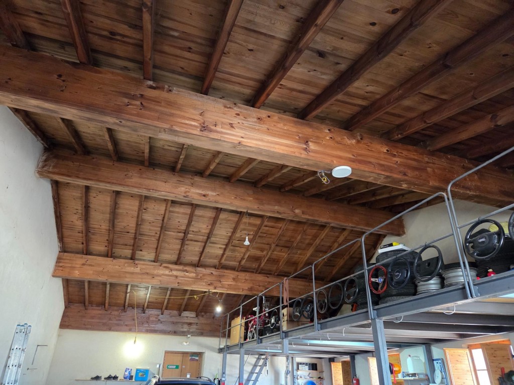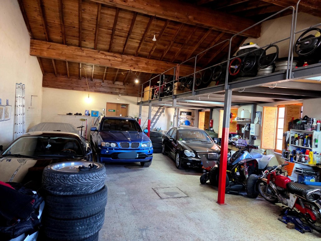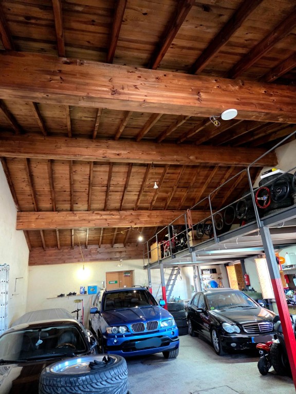 Uno de los grandes atractivos es su garaje con capacidad para hasta seis vehículos, parte es este esta a doble altura y los techos forados de madera lo hacen aún mas bonito.