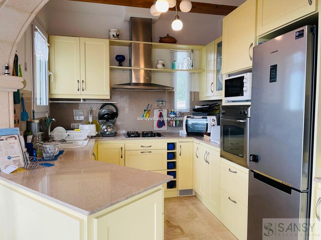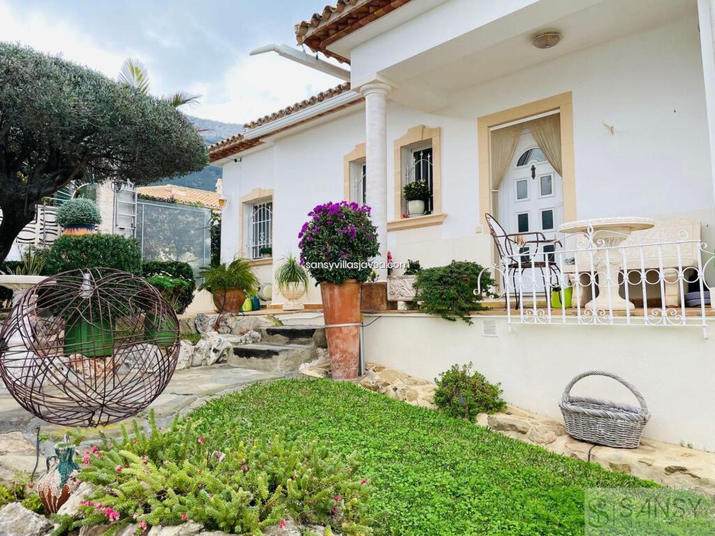 Villa 4 dormitorios, 4 baños, 0 garajes, Buen estado, en Dénia, Alicante Este Chalet se encunetra en una buena zona residencial de Denia con muy buenas vistas al mar y panoramicas. Se destribuye en tres pantas , con amplio salon/ comedor con salida a una terraza acristalada donde se aprecia las vistas . La cocina es abierta y estar equipada, 4 dormitorios con armarios empotrados , 4 baños dos de ellos on suite , 1 aseo. Apartamento de invitados con acceso des de la casa. Piscina climatizada por placas solar, jardin de facil mantenimiento. Sala de juego y 3 trasteros , la casa se encuentra en perfecto estado