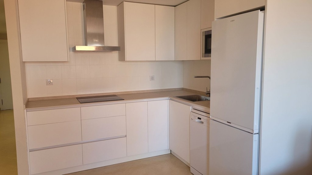 Una cocina moderna totalmente equipada con muebles altos y bajos, frigorífico-congelador, lavavajillas, placa de cocina y microondas;
