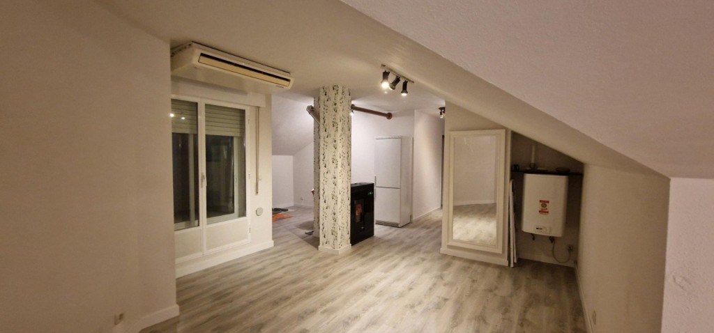 Ático abuhardillado de 81 m² totalmente reformado a estrenar, con ascensor desde el garaje. Vivienda luminosa con salón-comedor y cocina abierta amueblada en roble macizo con electrodomésticos, 1 habitación amplia, baño completo y posibilidad de una segunda habitación.
