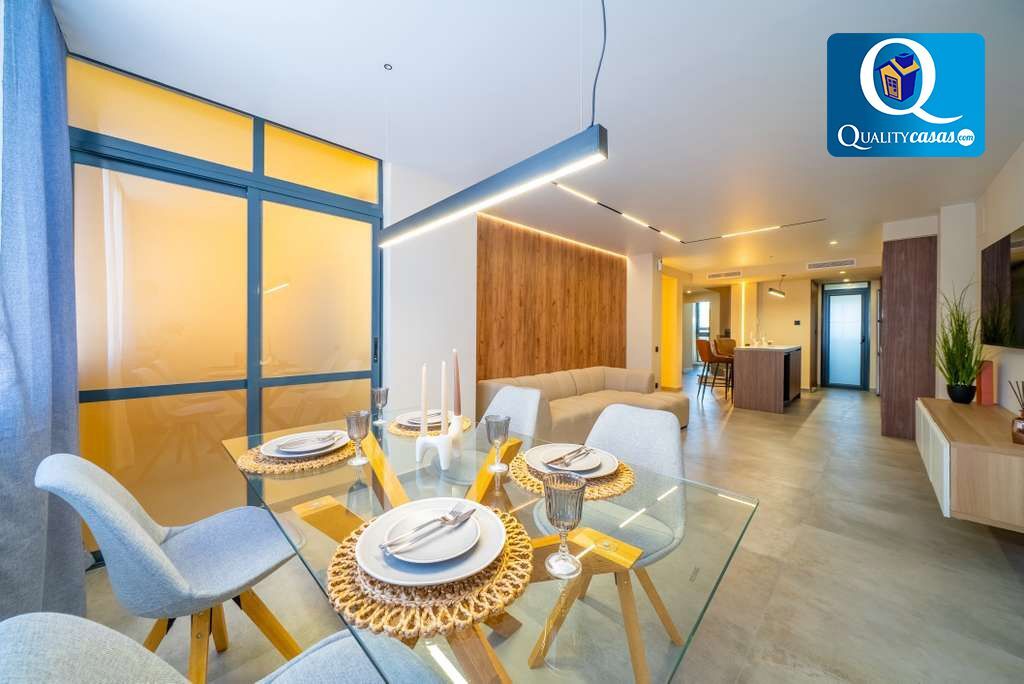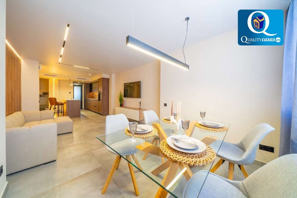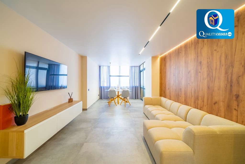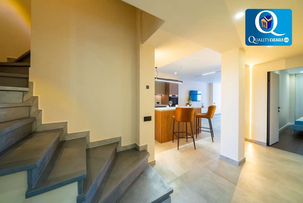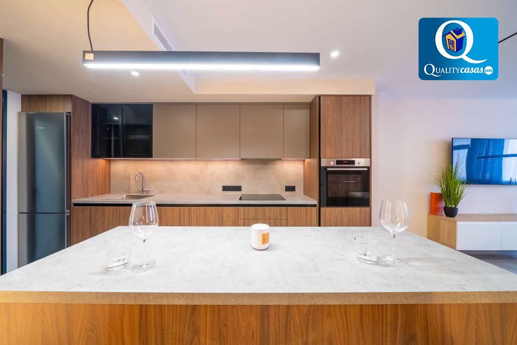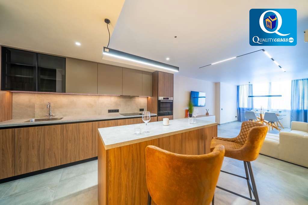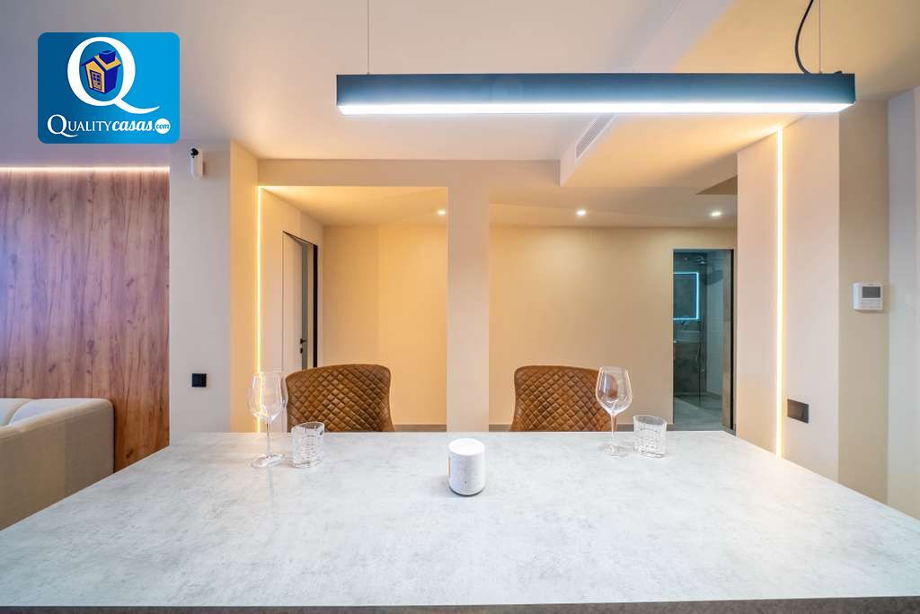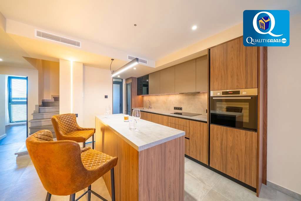 El amplio y luminoso salón, muy bien comunicado y con dos ambientes, dispone de moderna cocina office integrada, totalmente equipada y con todos los electrodomésticos. El salón de comunica con la amplia terraza solárium de la planta superior, con excelentes vistas. La vivienda cuenta con 3 dormitorios y 2 baños completos (el principal en suite).