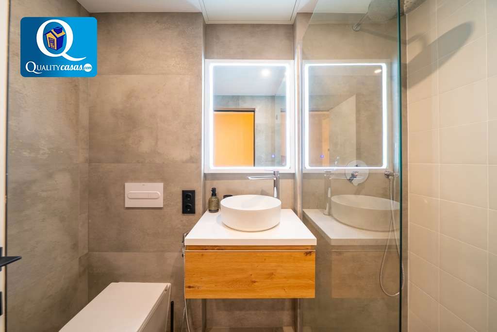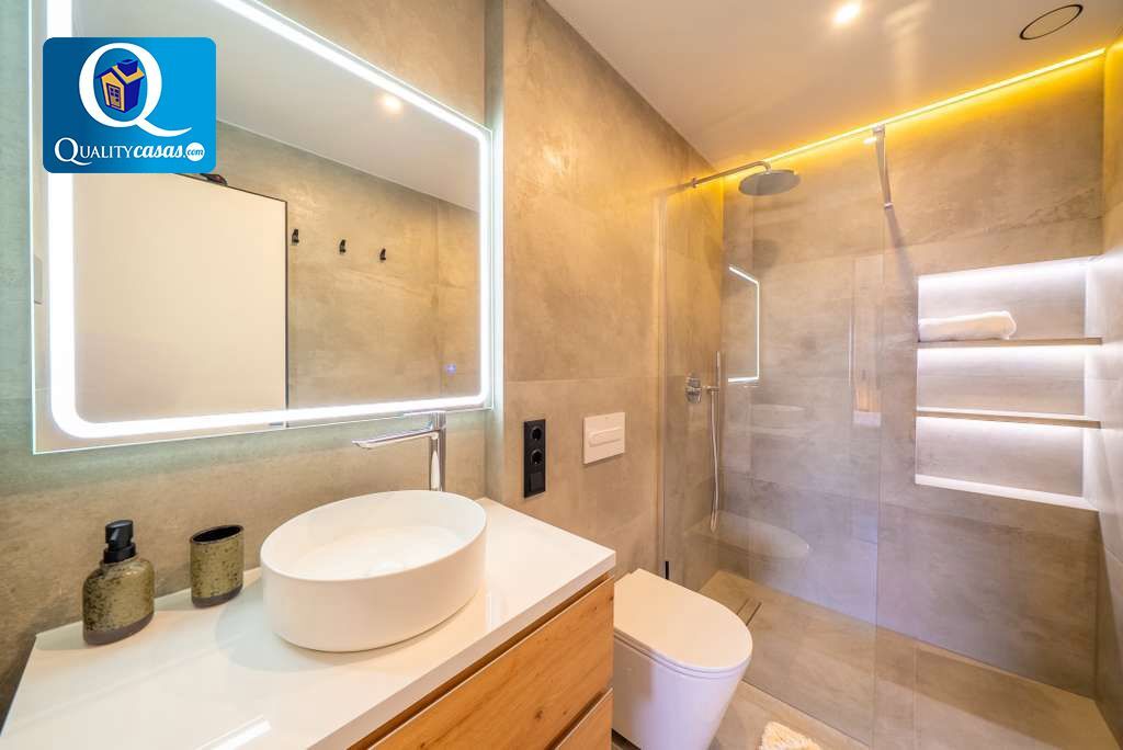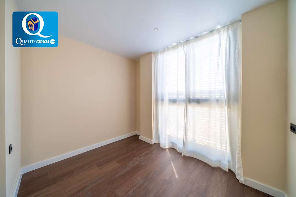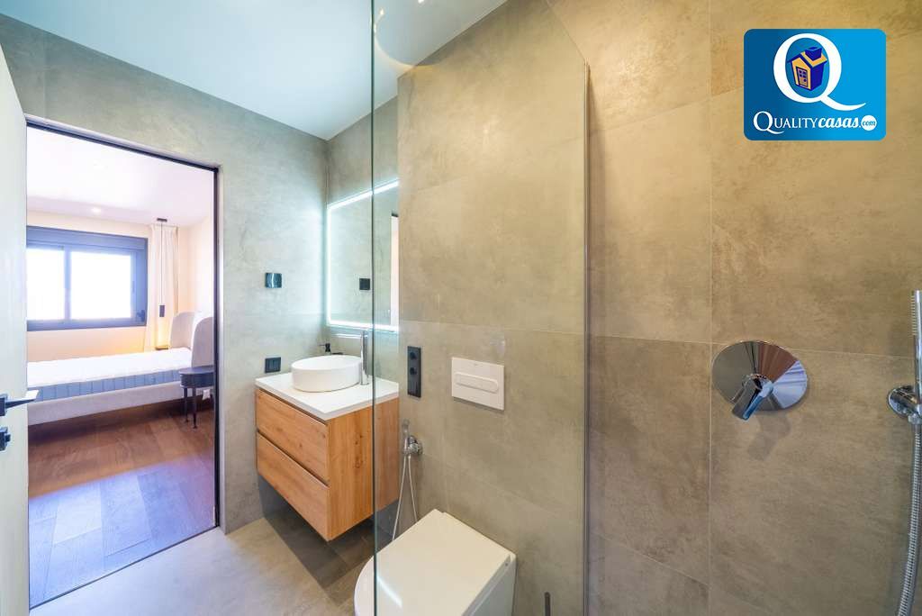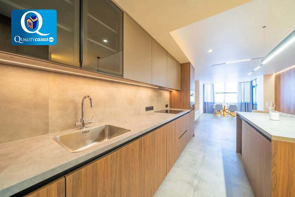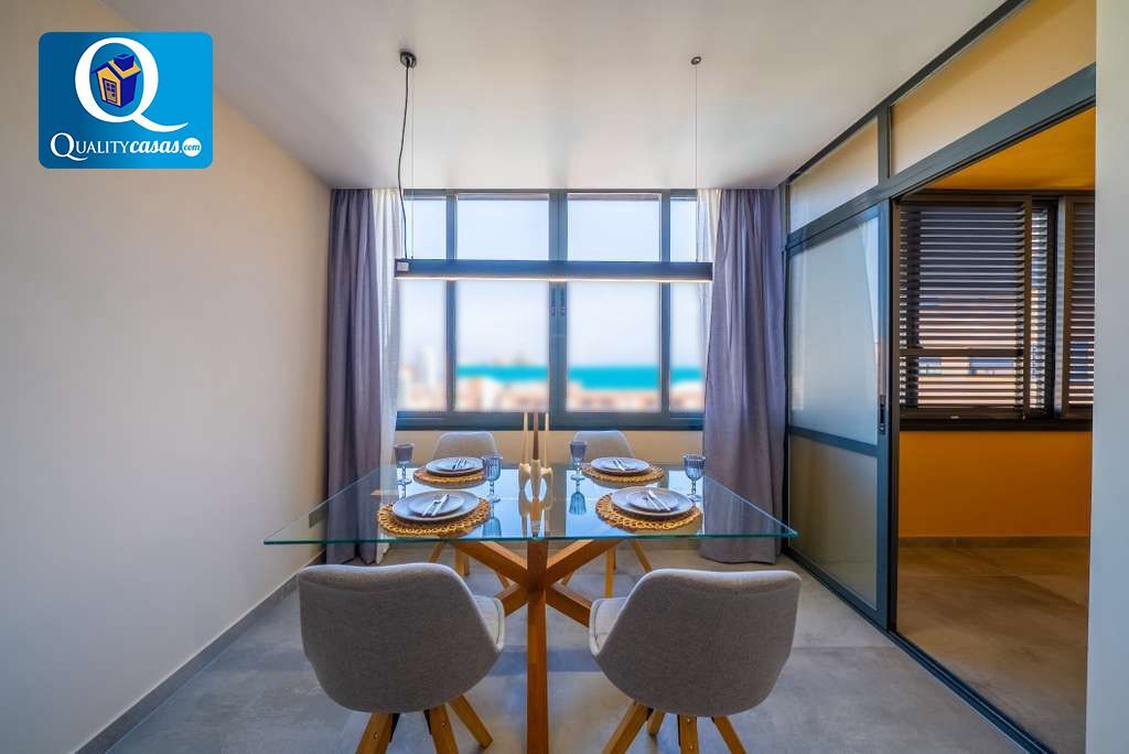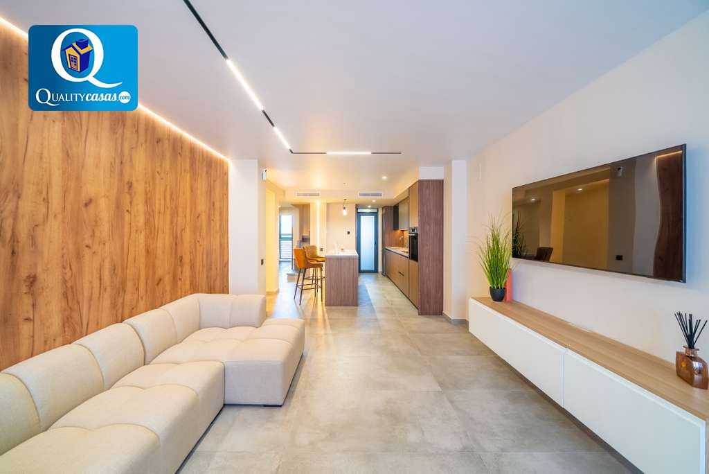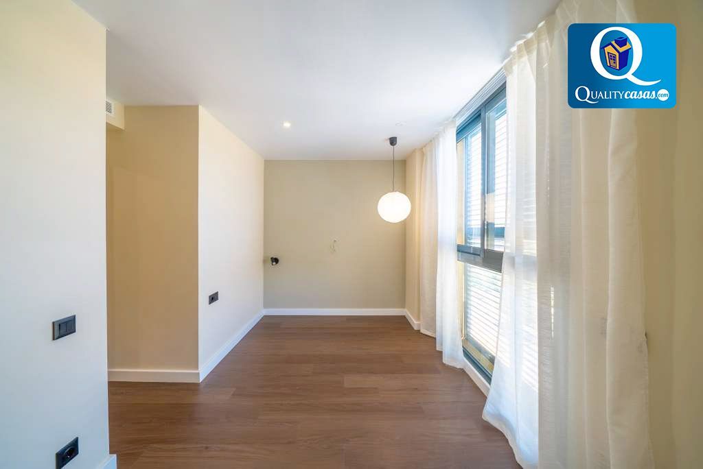 El amplio y luminoso salón, muy bien comunicado y con dos ambientes, dispone de moderna cocina office integrada, totalmente equipada y con todos los electrodomésticos. El salón de comunica con la amplia terraza solárium de la planta superior, con excelentes vistas. La vivienda cuenta con 3 dormitorios y 2 baños completos (el principal en suite).